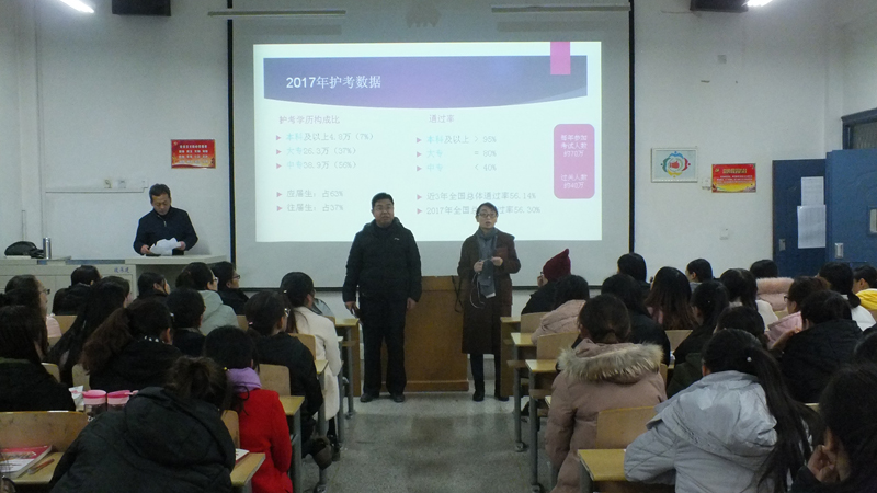 此次講座由去西安參加2018年護考師資培訓的牛子勁老師主講。牛老師分別從2017年護考成績數(shù)據(jù)分析、護考試題新特點,以及2018年護考命題的趨勢進行了詳細分析與說明,并且提出了應對策略。他希望2015級護考生準確把握護考形勢,確定應考學習計劃,結合護考要求加強專業(yè)課學習,在明年的護考中取得好成績。