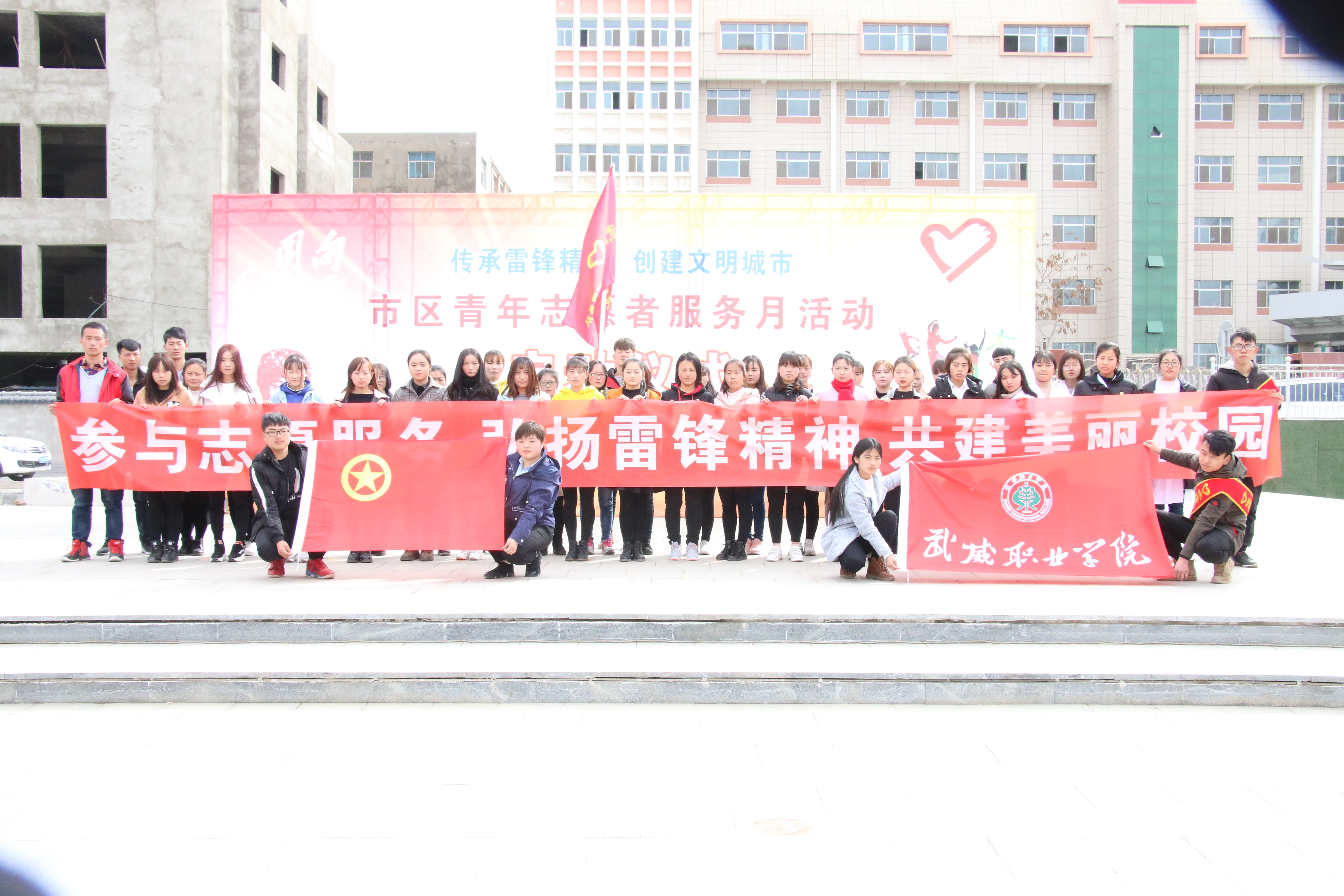 今年是毛澤東等老一輩革命家為雷鋒同志題詞55周年,3月5日是中國青年志愿者服務日。 3月5日下午,學院50名志愿者在武威市文化廣場參加了全市志愿者服務月活動啟動儀式,活動現(xiàn)場氣氛熱烈,市領導為我院志愿服務隊進行了授旗,青年志愿者代表宣讀了倡議書,全體志愿者重溫了青年志愿者誓詞。