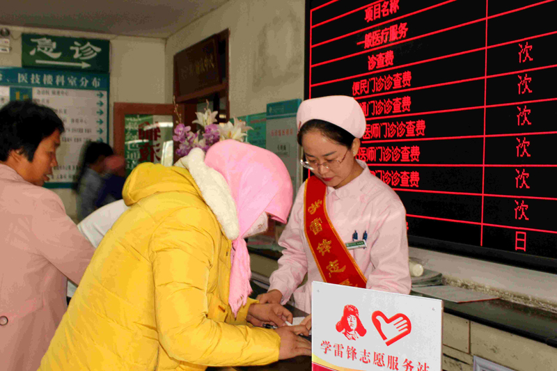 學雷鋒志愿服務站工作人員主要由年輕護士們擔任。她們身著護士裝,佩戴印有“學雷鋒志愿者服務”字樣綬帶,主動為患者服務。志愿者們提供的主要服務項目有:在門診為老、弱、病、殘、孕等患者提供輪椅擔架租借。為患者提供開水、就醫(yī)導診、戒煙勸導、醫(yī)學人文關懷、慢性病知識普及和健康宣教等便民利民服務,受到了患者及家屬的一致好評。