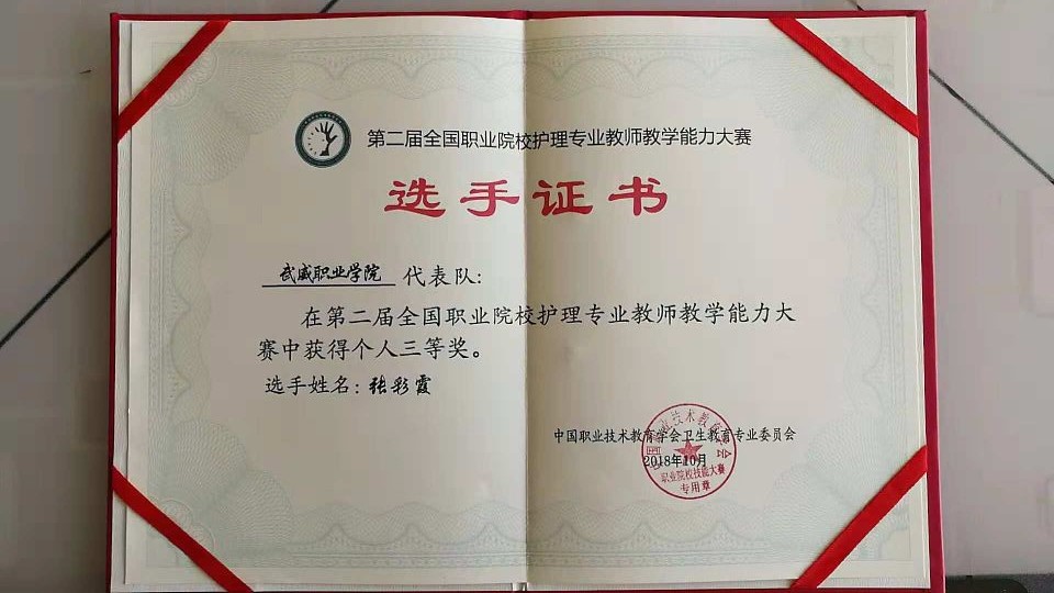 競(jìng)賽共分為理論考核、說(shuō)課程和臨床護(hù)理技能操作三個(gè)部分。其中,臨床護(hù)理技能操作部又分為三項(xiàng),心肺復(fù)蘇術(shù)和靜脈輸液操作技術(shù)為必選項(xiàng)目,置胃管技術(shù)和氣管切開(kāi)護(hù)理技術(shù)為抽選項(xiàng)目。經(jīng)過(guò)三天緊張激烈的比拼,通過(guò)了全部考核內(nèi)容的綜合評(píng)定,最終張彩霞老師獲得了三等獎(jiǎng)。
