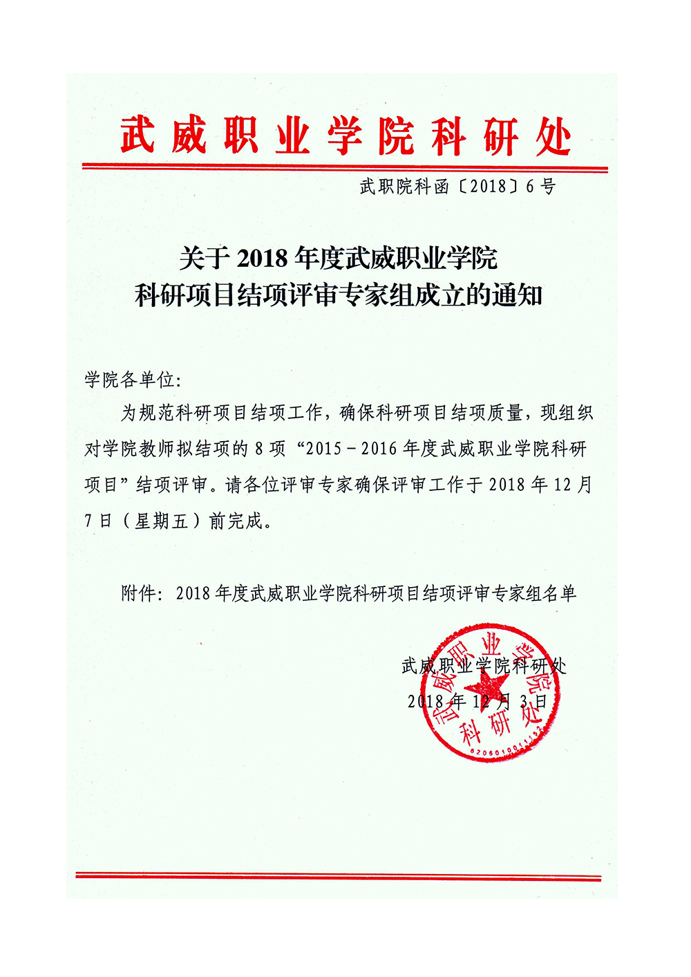 關(guān)于2018年度武威職業(yè)學院科研項目結(jié)項評審專家組成立的通知