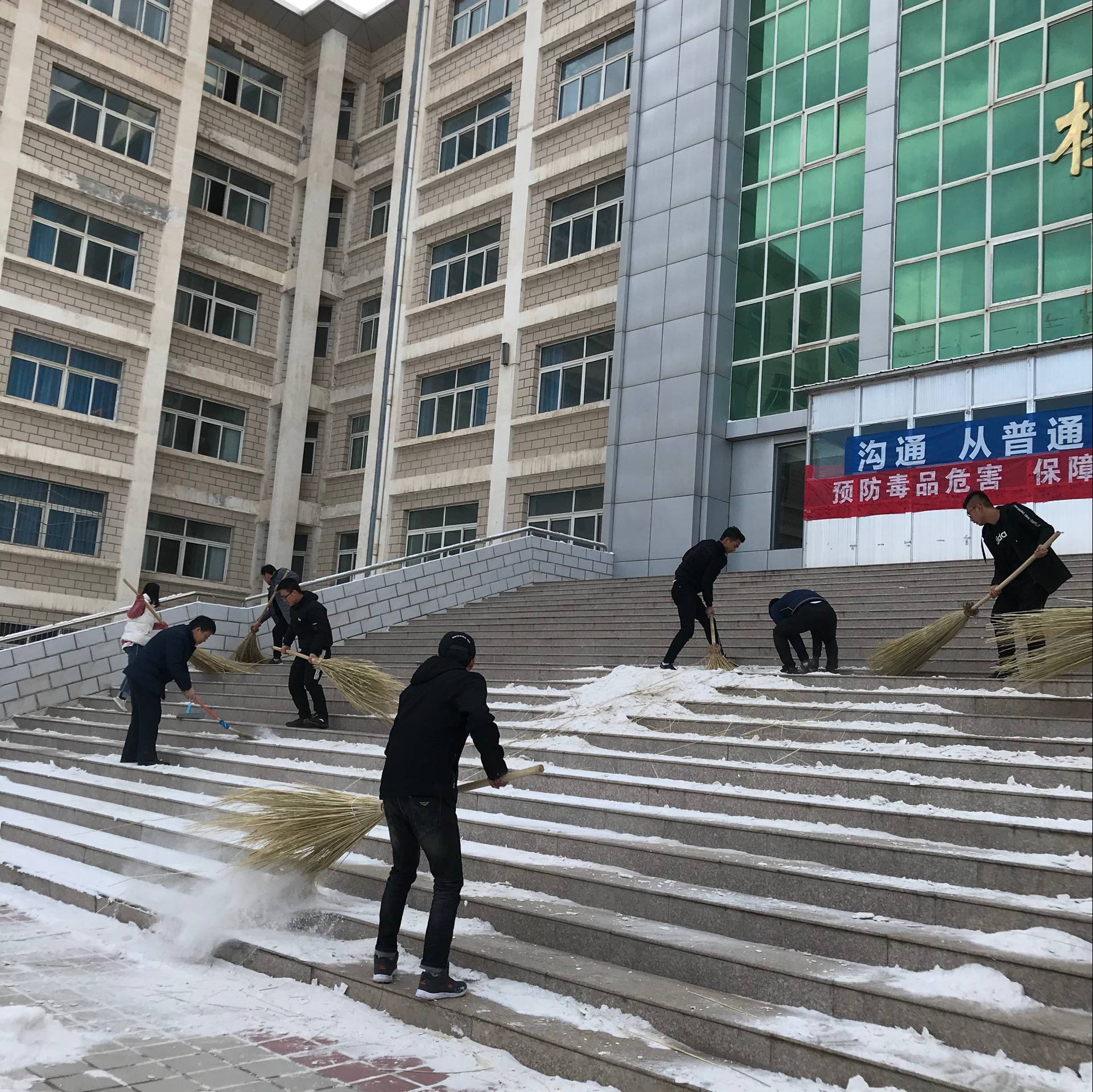 此次活動在博學(xué)樓前開展,10多名黨員及入黨積極分子參加此次活動。大家?guī)е鴴咧恪Ⅳせ惹鍜吖ぞ?,在利用課間操的時間將行人走道及樓梯的落雪全部清掃干凈,為校園師生提供了良好的行走安全、衛(wèi)生環(huán)境。