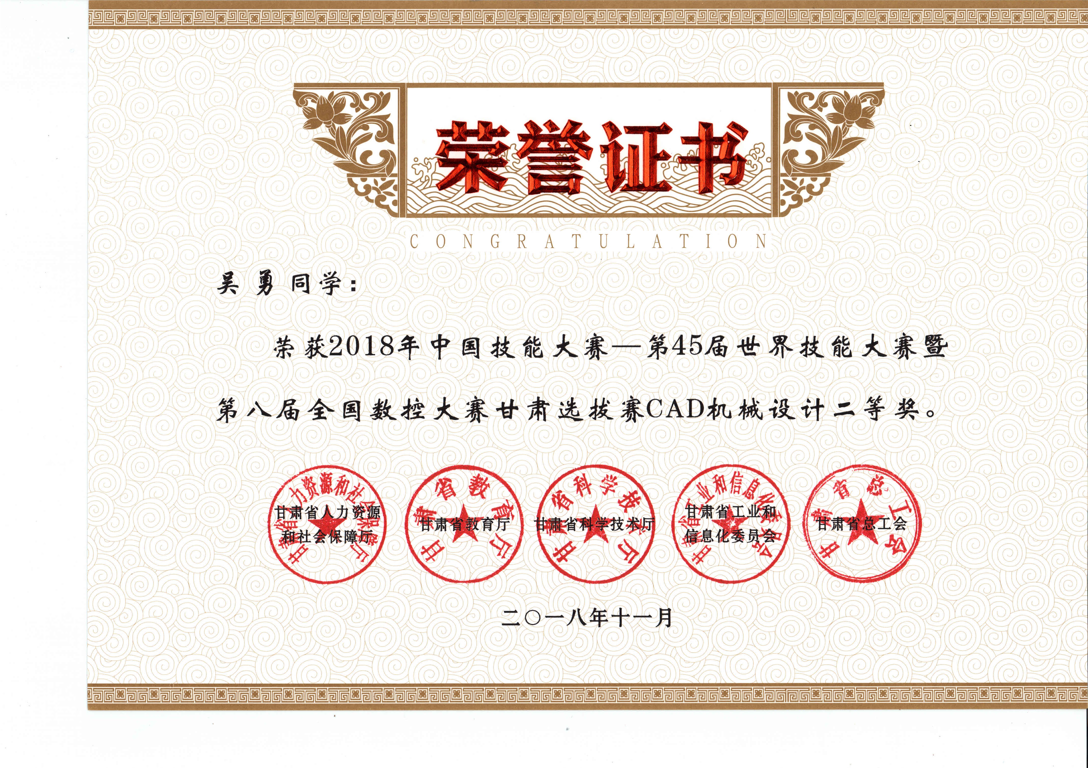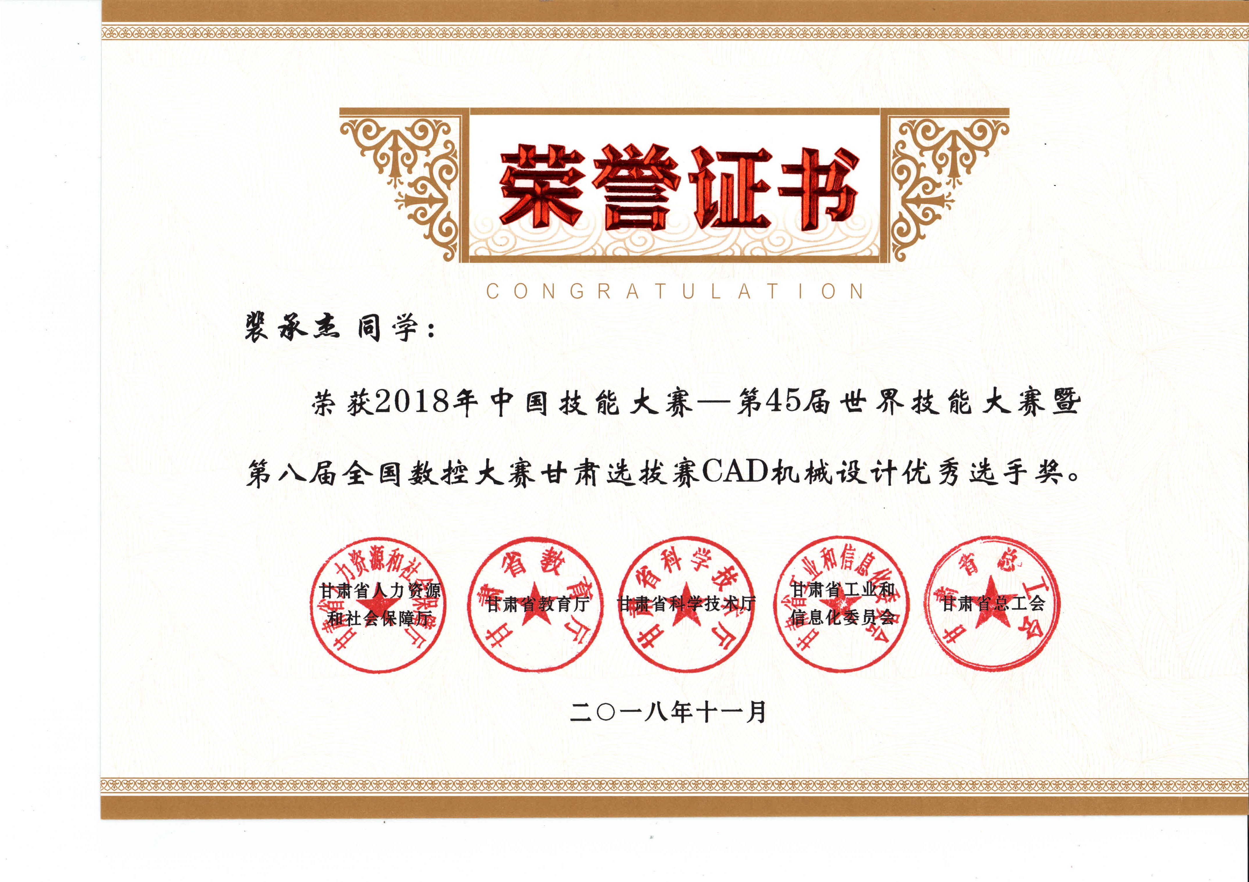 2018年中國技能大賽--第45屆世界技能大賽暨第八屆全國數(shù)控大賽甘肅選拔賽(CAD機械設(shè)計項目)獲獎證書