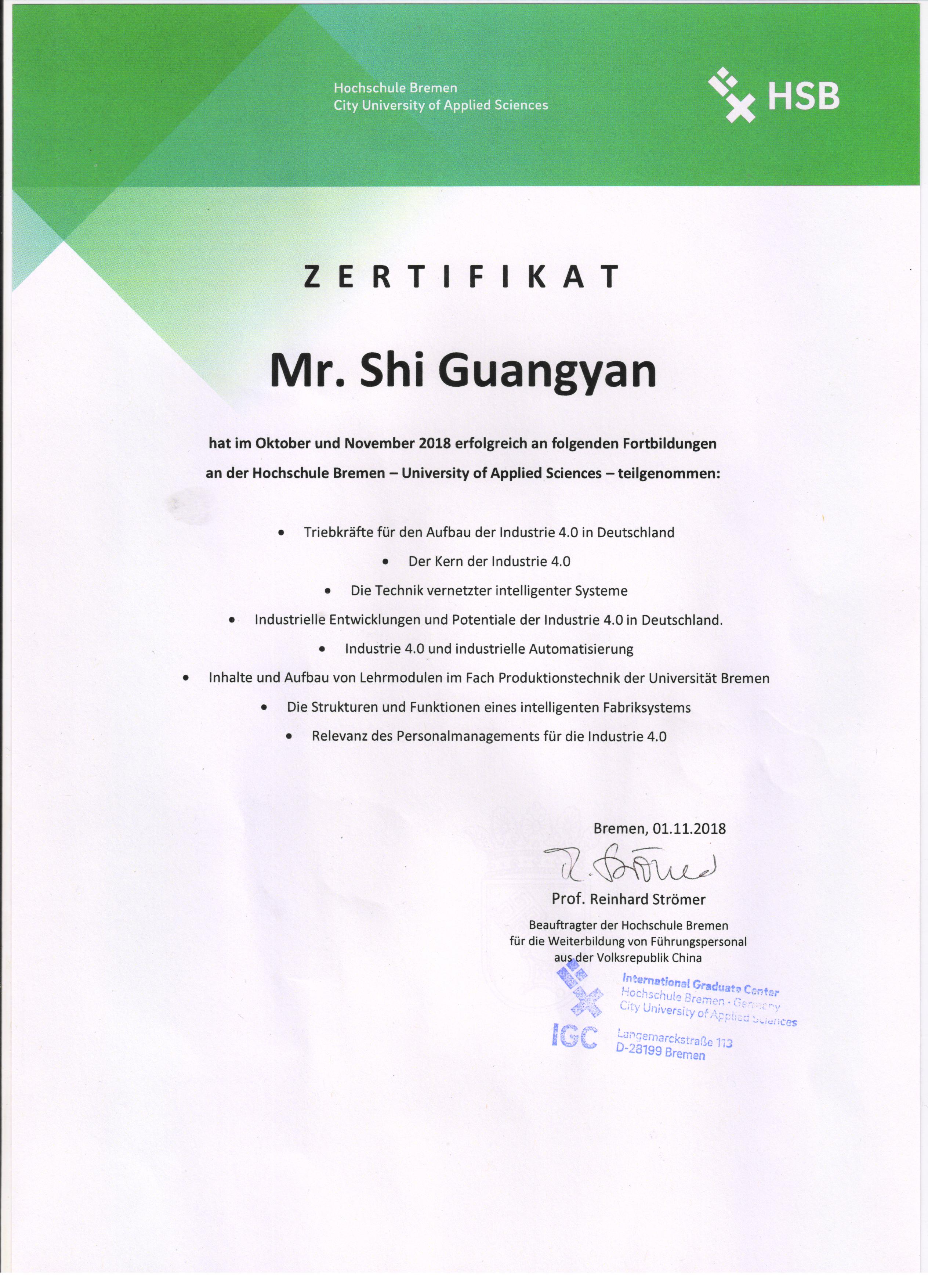 ?史光巖老師參加由甘肅省外專局組織的2018年出國(境)培訓(xùn)項目計劃,前往德國不萊梅應(yīng)用科技大學(xué)參加為期14天的“工業(yè)4.0工廠實驗室建設(shè)培訓(xùn)團”。