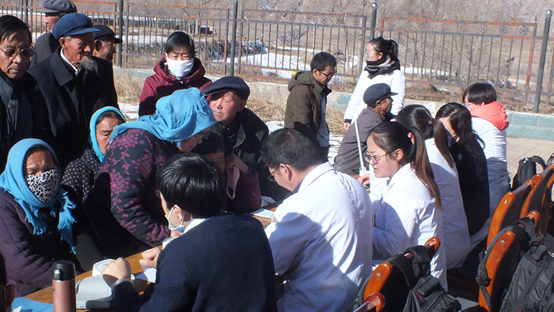 到達(dá)目的地后,黨員們不顧辛勞,分成兩組,一組由護(hù)理系黨總支書記張建輝帶領(lǐng)前往臥病在床的扶貧對(duì)象家里,親切詢問(wèn)病情及家里近況,送上常備藥品。另一組在當(dāng)?shù)卮宀窟M(jìn)行義診活動(dòng),醫(yī)護(hù)人員仔細(xì)給村民們進(jìn)行體檢,耐心解答、細(xì)心診治;對(duì)前來(lái)問(wèn)診的村民認(rèn)真進(jìn)行血壓、血糖、丙肝等項(xiàng)目的檢測(cè)、免費(fèi)發(fā)放藥品并對(duì)糖尿病、高血壓等慢性病的飲食、活動(dòng)和用藥進(jìn)行指導(dǎo),普及衛(wèi)生常識(shí)和健康知識(shí)。醫(yī)護(hù)人員的精心服務(wù)讓村民們倍感欣慰,受到了他們的熱烈歡迎和一致稱贊。