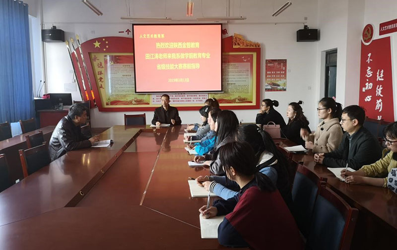 2019年3月13日下午,人文藝術(shù)教育系邀請(qǐng)陜西金智教育集團(tuán)講師、山西省“國培計(jì)劃”學(xué)前教育專業(yè)領(lǐng)域客座講師田江濤老師到我系進(jìn)行了學(xué)前教育專業(yè)省級(jí)技能大賽專題培訓(xùn)講座,并對(duì)2019年甘肅省職業(yè)院校學(xué)前教育專業(yè)技能比賽的流程進(jìn)行了指導(dǎo)。系副主任李欣、各專業(yè)教師及參賽學(xué)生參加。