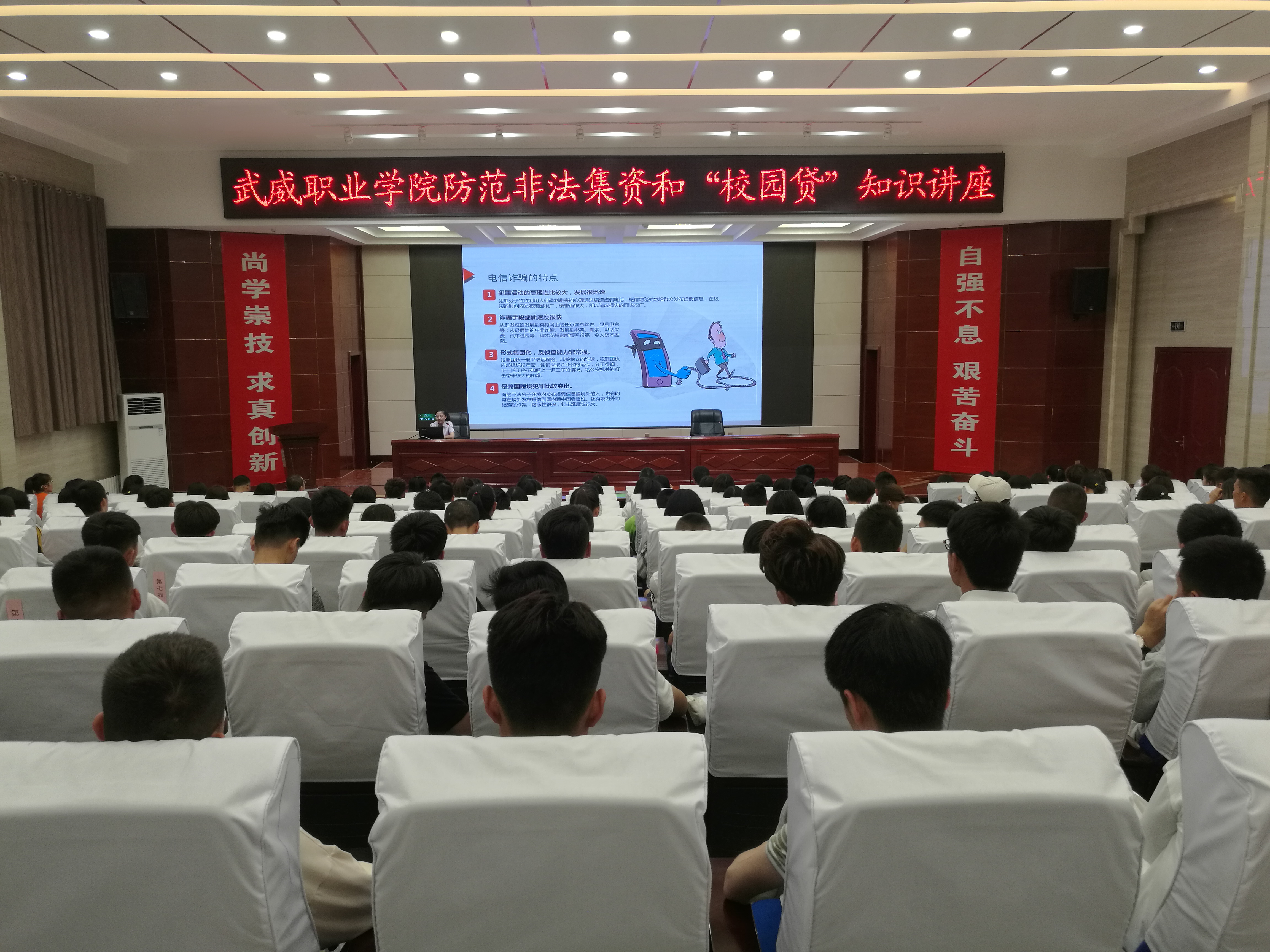 為深入貫徹落實甘肅省2019年防范非法集資和金融領域掃黑除惡宣傳月活動的有關精神,保護廣大師生的合法權益。6月9日晚,學院邀請中國農(nóng)業(yè)銀行武威支行風險管理部工作人員朱琳在學院菁英廳作了關于防范非法集資和校園貸知識講座,學院副院長王永緒出席活動,保衛(wèi)處、計劃財務處負責同志及各系師生代表200余人聆聽了講座。