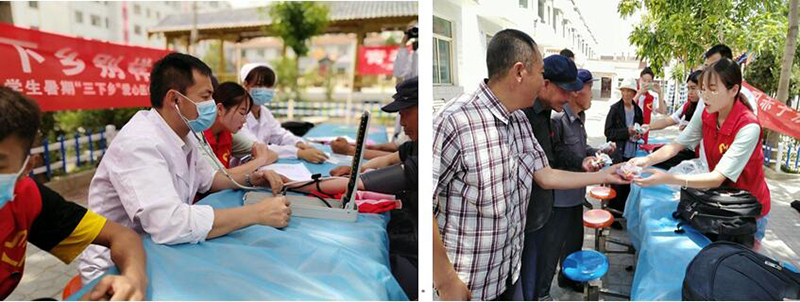 醫(yī)療服務團每到一個服務點,當?shù)氐拇迕穸紩吁喽鴣恚瑦坌尼t(yī)療服務團的隊員顧不上休息就迅速投入到診療服務中,對于每位咨詢及就診的群眾,老師和隊員都是熱情認真、耐心細致、深入淺出地一一講解。有的志愿者協(xié)助老師為就診群眾測量血壓、血糖,面對血壓和血糖偏高的老人,告之他們檢查指標偏高的危險,提醒他們聽從醫(yī)囑按時服藥,有的志愿者進村入戶,發(fā)放〈夏季常見病防治知識〉宣傳單,開展醫(yī)療衛(wèi)生知識宣傳教育活動,幫助村民提高自我保健意識,尤其是對一些常見病、多發(fā)病的認識,以便做到早發(fā)現(xiàn)、早診斷、早治療?;顒又谐肆x診和宣教,還教會了部分居民針對呼吸心跳驟停病人盡快施行心肺復蘇(CPR)的現(xiàn)場應急救護技術。