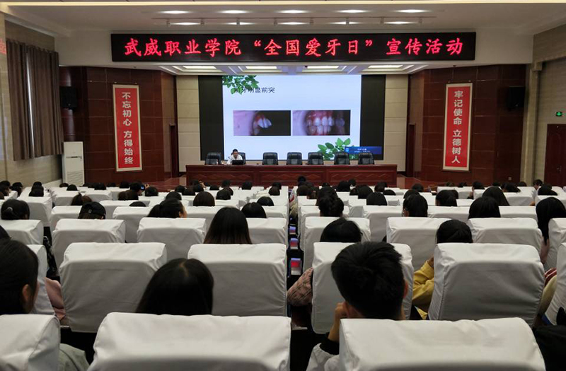 學(xué)院婦聯(lián)邀請武威腫瘤醫(yī)院口腔科主任韓冬做題為《青年口腔保健知識(shí)》的講座。韓冬結(jié)合多年口腔疾病診療經(jīng)驗(yàn),從青年口腔衛(wèi)生、口腔疾病預(yù)防及口腔正畸處理等方面入手,做了精彩講解,借助牙齒道具展示了正確的刷牙方法,并對同學(xué)們的各類口腔問題作了解答。講座結(jié)束后,武威腫瘤醫(yī)院和愛牙協(xié)會(huì)在大學(xué)生活動(dòng)中心前廣場為同學(xué)們開展義診活動(dòng),發(fā)放口腔健康宣傳資料600余份。