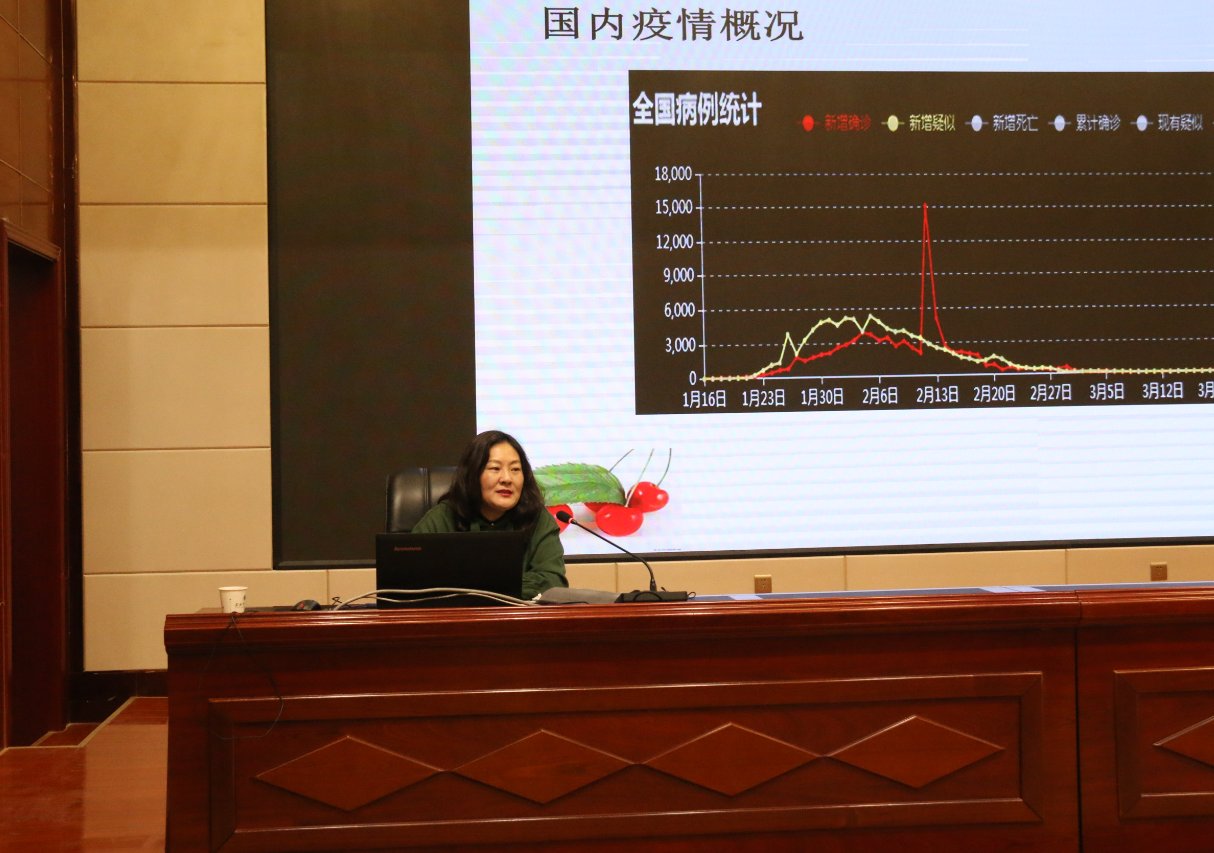 馬艷主任以《新冠肺炎疫情防控》為題,從國內外疫情分析、對新冠肺炎的認識、大專院校新冠肺炎疫情防控要求措施以及開學后應該注意哪些問題等幾個方面做了深入講解。