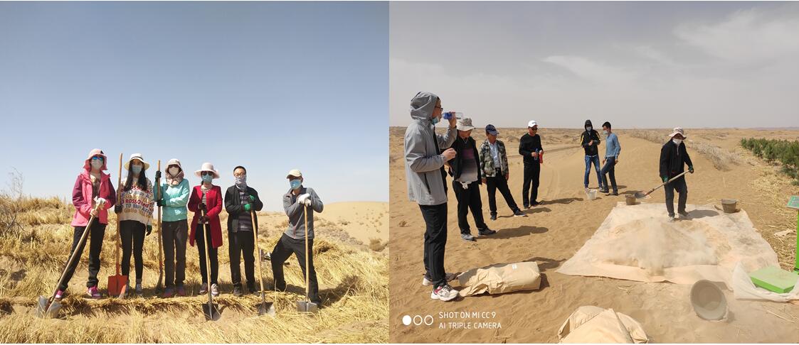 由我院與中科武威新能源研究所合作的淀粉基超級吸水材料在沙漠植保工程示范試驗項目組成員自4月8日起已陸續(xù)赴武威園區(qū)、民勤縣青土湖,涼州區(qū)長城鎮(zhèn)、古浪八步沙等地推廣應用工作,陸續(xù)實施壓沙、沙生苗木種植、植被樣點監(jiān)測等,截至目前累計完成壓沙任務300畝,苗木種植任務220畝。