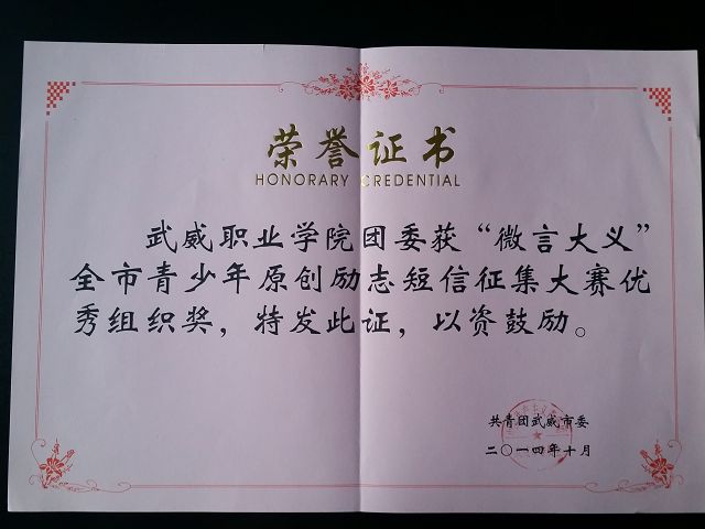 院團(tuán)委在武威市“微言大義”青少年原創(chuàng)勵志短信征集大賽中獲獎