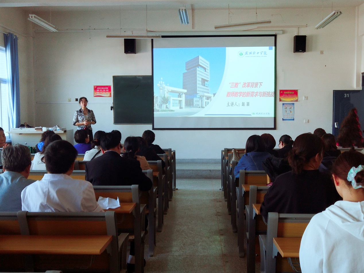 赴揚州參加學(xué)習(xí)的護理系基礎(chǔ)教研室教師趙穎就8月16日至22日期間的學(xué)習(xí)內(nèi)容向大家作了詳細匯報。此次匯報的內(nèi)容主要包括題目解析和“三教”改革的對策與舉措兩大部分。趙穎借助PPT,通過生動的語言,詳實的例子,結(jié)合我系實際情況,分享交流有關(guān)《“三教”改革背景下教師教學(xué)的新需求與新挑戰(zhàn)》的學(xué)習(xí)內(nèi)容,傳遞了職業(yè)教育改革和發(fā)展信息化發(fā)展的方向,介紹了“三教”改革背景下教師教育教學(xué)面對的新要求、新挑戰(zhàn)以及教師如何應(yīng)對這些挑戰(zhàn)并將自己的學(xué)習(xí)心得體會與大家作了分享。