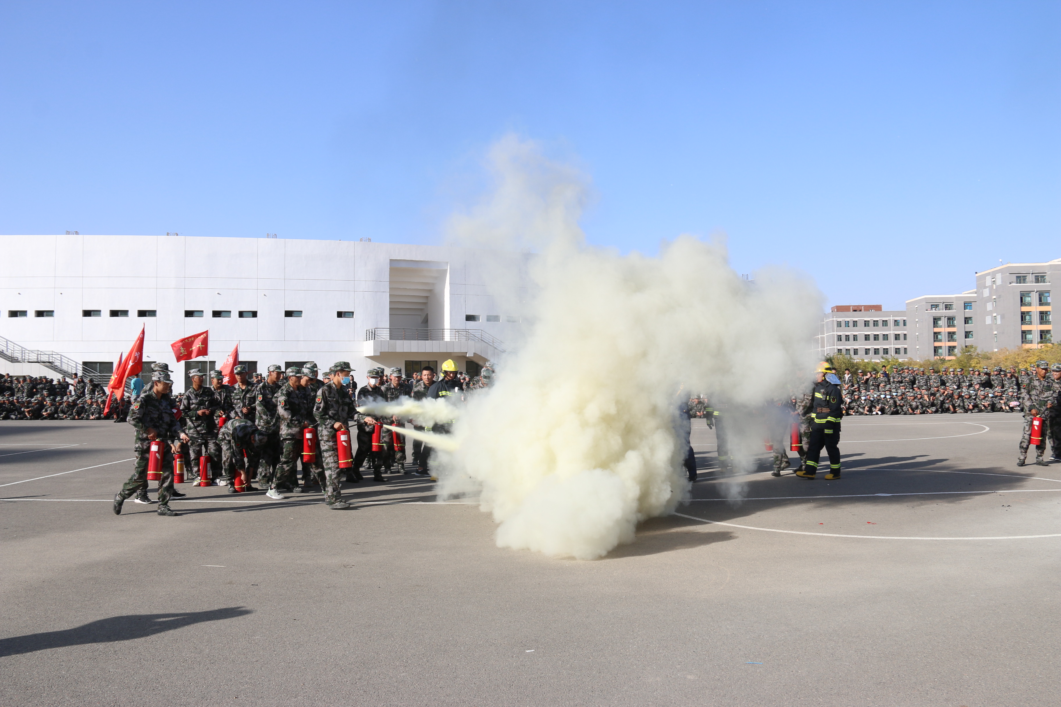 隨后,2020級全體新生整隊到操場參加了滅火演練。在消防救援中隊指戰(zhàn)員的講解和示范下,同學們學習了應急逃生、火災報警和滅火器使用等消防安全常識,學生代表體驗了處置液化氣瓶滅火、油鍋滅火、干粉滅火器滅火等操作,在實戰(zhàn)中提高了消防應急能力。