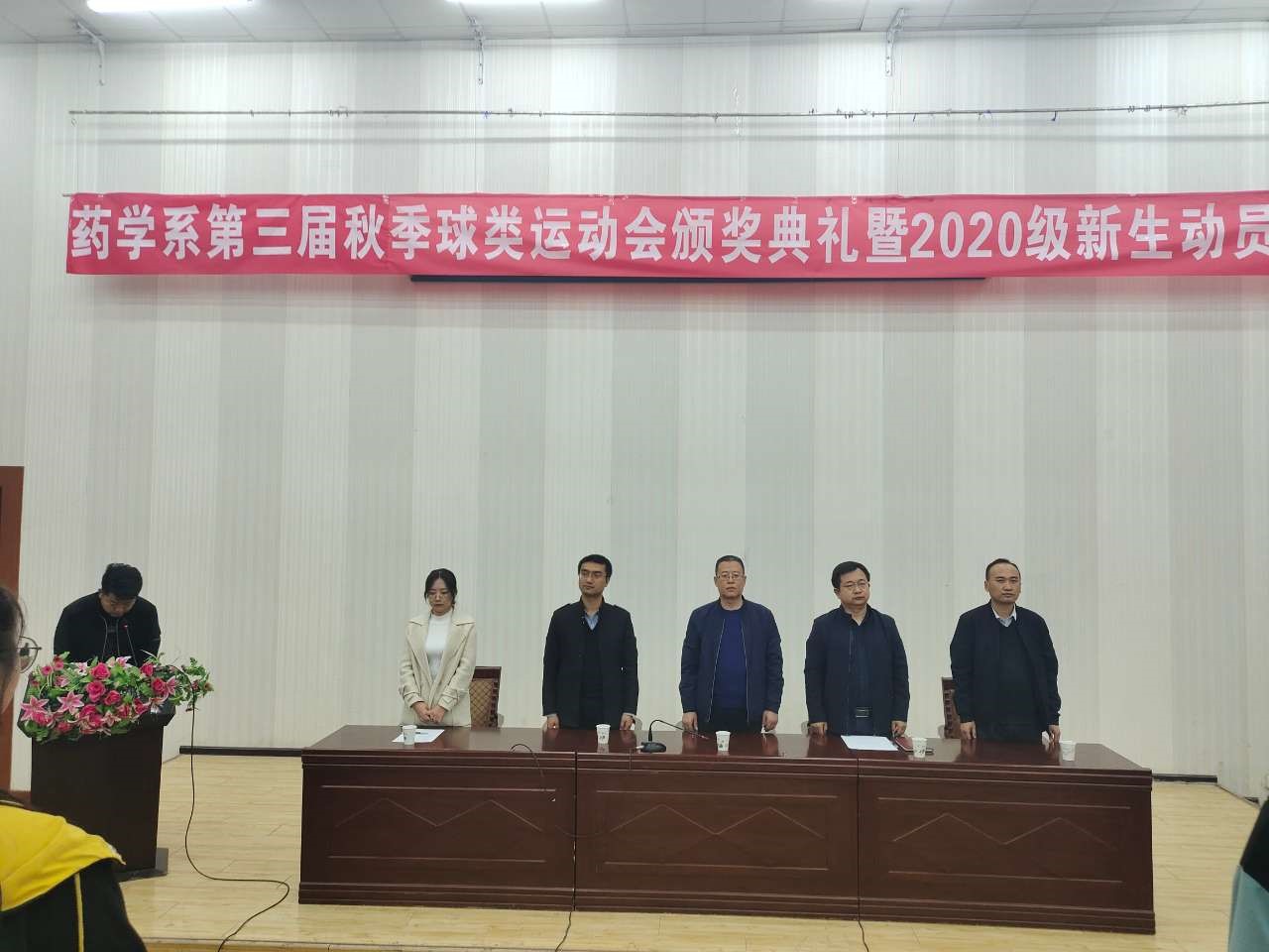 2020年10月30日下午,藥學系第三屆秋季球類運動會頒獎典禮暨2020級新生動員大會在正德廳隆重舉行。藥學系黨總支書記、主任魏潤明、副主任楊建美、黨建專職組織員陳輝生、教學秘書王建強、學籍管理員徐錦鳳、各班主任及18、19、20級學生代表出席大會。