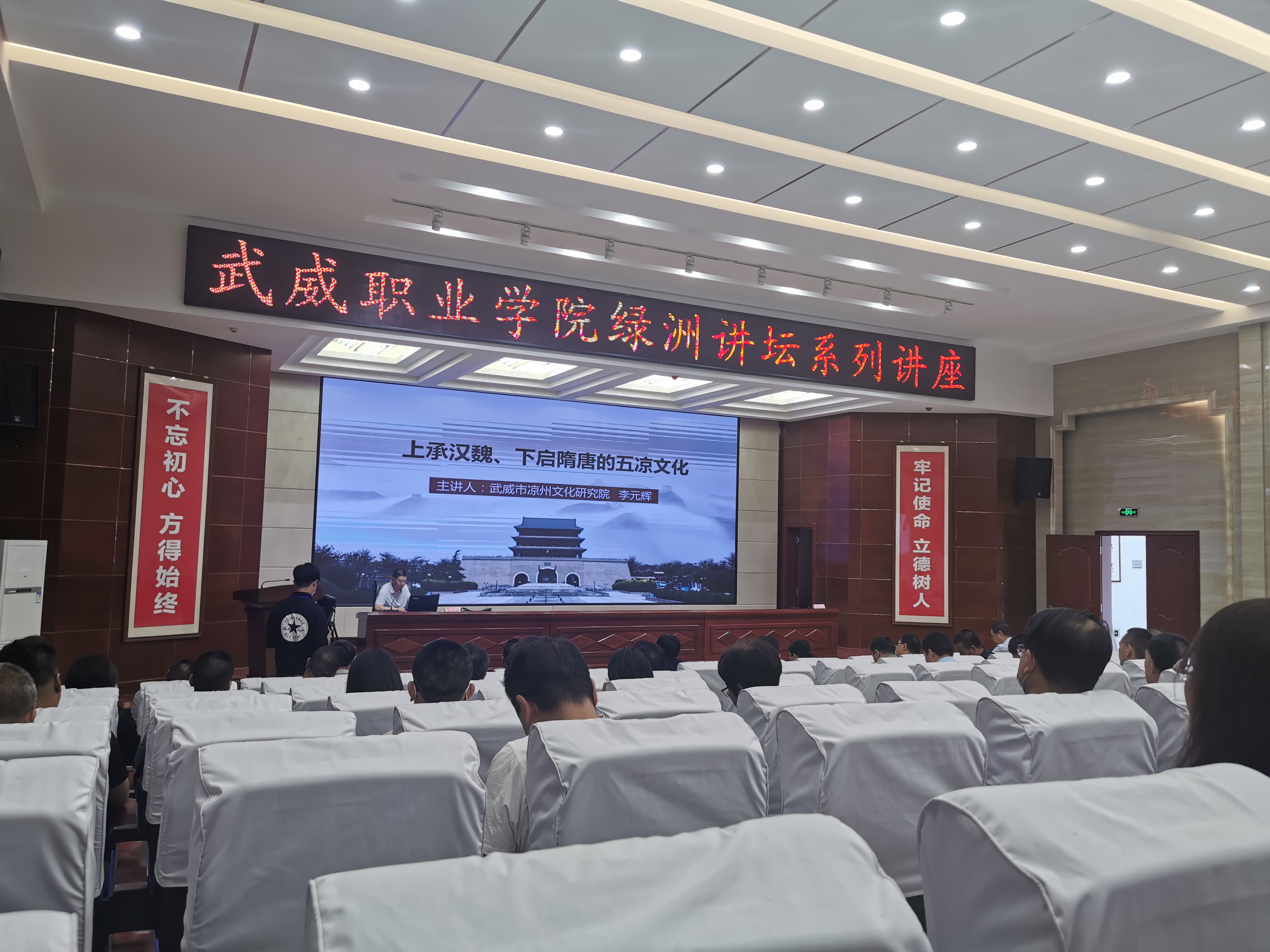 6月12日上午,學(xué)院第34期“綠洲講壇”在菁英廳舉辦,邀請(qǐng)武威市涼州文化研究院研究員、涼州文化研究資深專家李元輝作題為《上承漢魏,下啟隋唐的五涼文化》的專題報(bào)告。蒞臨報(bào)告會(huì)的有涼州文化研究院副院長(zhǎng)王守榮同志,涼州文化研究院文史工作者柴多茂、趙大泰、楊琴琴等同志。學(xué)院領(lǐng)導(dǎo)、中層干部和師生代表共150人聆聽(tīng)了報(bào)告。報(bào)告會(huì)由學(xué)院黨委副書(shū)記翟存祥主持。