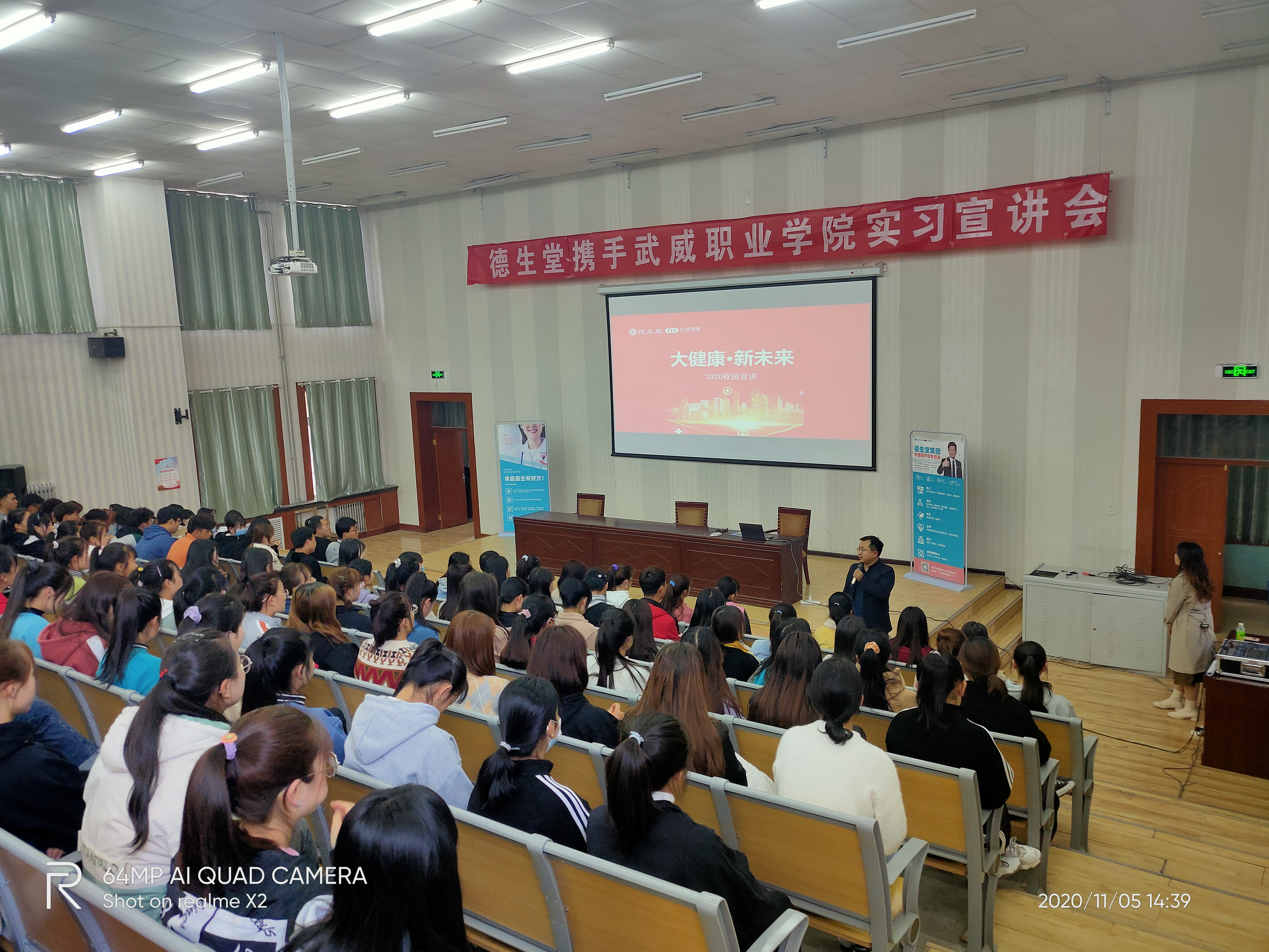 2020年11月5日,武威職業(yè)學(xué)院藥學(xué)系攜手德生堂在正德廳舉辦實(shí)習(xí)宣講會。藥學(xué)系黨總支書記、主任魏潤明、藥學(xué)系副主任楊建美、德生堂集團(tuán)武威區(qū)域經(jīng)理呂福英及2021屆172名畢業(yè)生參加宣講會。