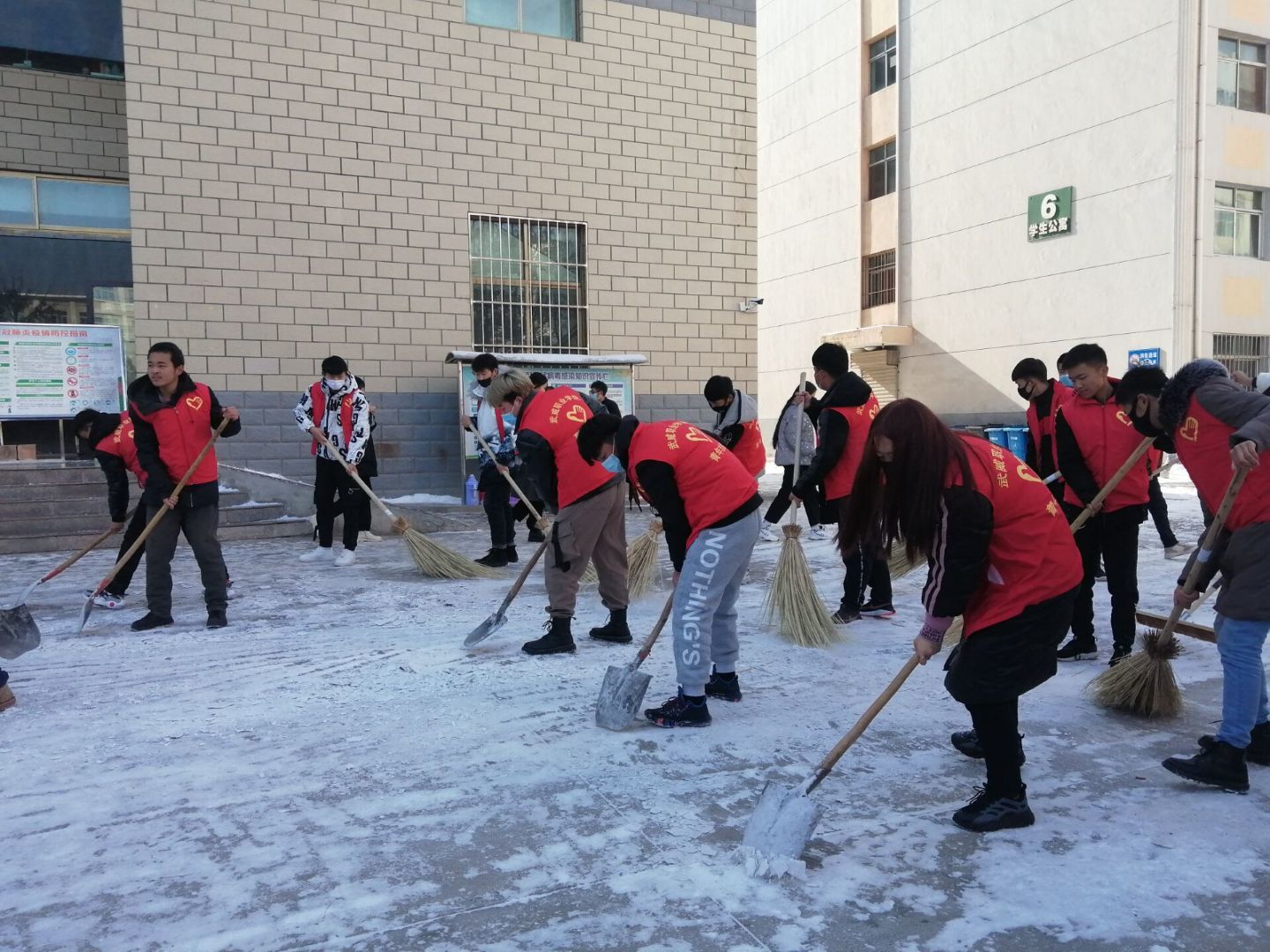 本次鏟雪的區(qū)域是教學(xué)樓區(qū)域的主干道和食堂門前道路。寒冷的天氣擋不住大家的勞動(dòng)熱情,厚厚的冰塊蓋不住大家的志愿精神。鐵鍬聲此起彼伏,大家分工明確,相互合作,現(xiàn)場(chǎng)氣氛熱烈。經(jīng)過多小時(shí)的勞動(dòng),大家將教學(xué)樓前主干道積雪基本清掃干凈。