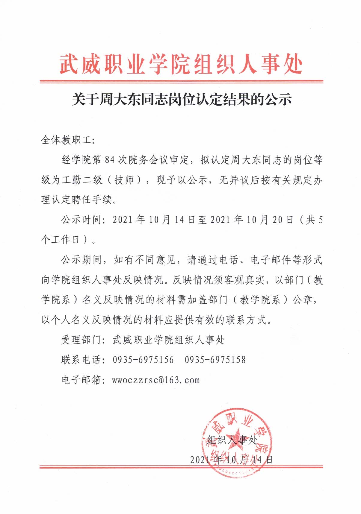 關(guān)于周大東同志崗位認定結(jié)果的公示