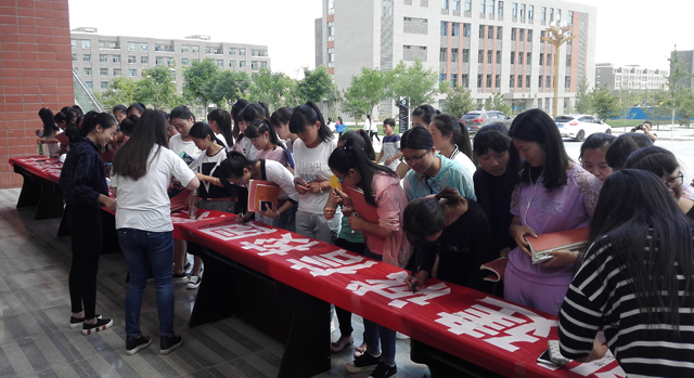 6月14日是第九個(gè)全國(guó)“信用記錄關(guān)愛日”。為進(jìn)一步加強(qiáng)我院學(xué)生的誠(chéng)信教育,結(jié)合當(dāng)前學(xué)院正在進(jìn)行的社會(huì)信用體系建設(shè)及國(guó)家助學(xué)貸款工作,當(dāng)日中午12時(shí),學(xué)生工作處在大學(xué)生活動(dòng)中心廣場(chǎng)發(fā)起“創(chuàng)建誠(chéng)信校園 樹立誠(chéng)信學(xué)風(fēng) 做誠(chéng)信學(xué)子”的主題簽名倡議活動(dòng)。200多名學(xué)生頂著炎炎烈日前來(lái)參加簽名活動(dòng),并在橫幅上鄭重簽下了自己的名字。