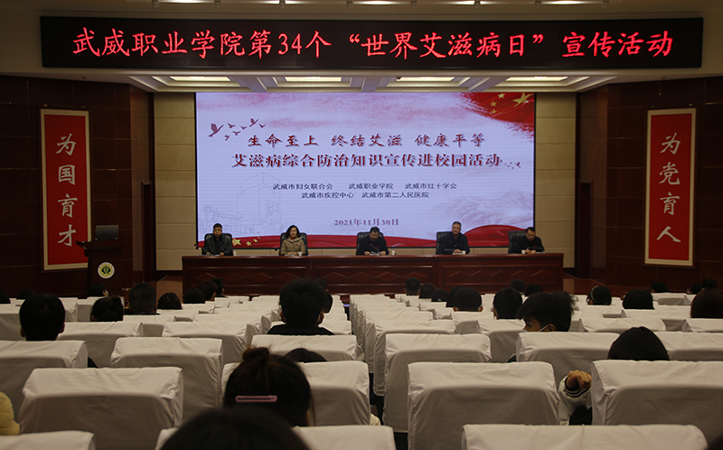 11月30日,學(xué)院在菁英廳開(kāi)展了“生命至上 終結(jié)艾滋 健康平等”艾滋病綜合防治知識(shí)宣傳進(jìn)校園活動(dòng)。市疾控中心工會(huì)主席張富國(guó)、市婦聯(lián)副主席張惠華、學(xué)院黨委委員、副院長(zhǎng)王守云,市第二人民醫(yī)院院長(zhǎng)滕亮出席活動(dòng),活動(dòng)由學(xué)院護(hù)理系黨總支書記張建輝主持,市紅十字會(huì)、市疾控中心、天馬行市民云數(shù)據(jù)有限公司工作人員及武威職業(yè)學(xué)院師生代表參加活動(dòng)。