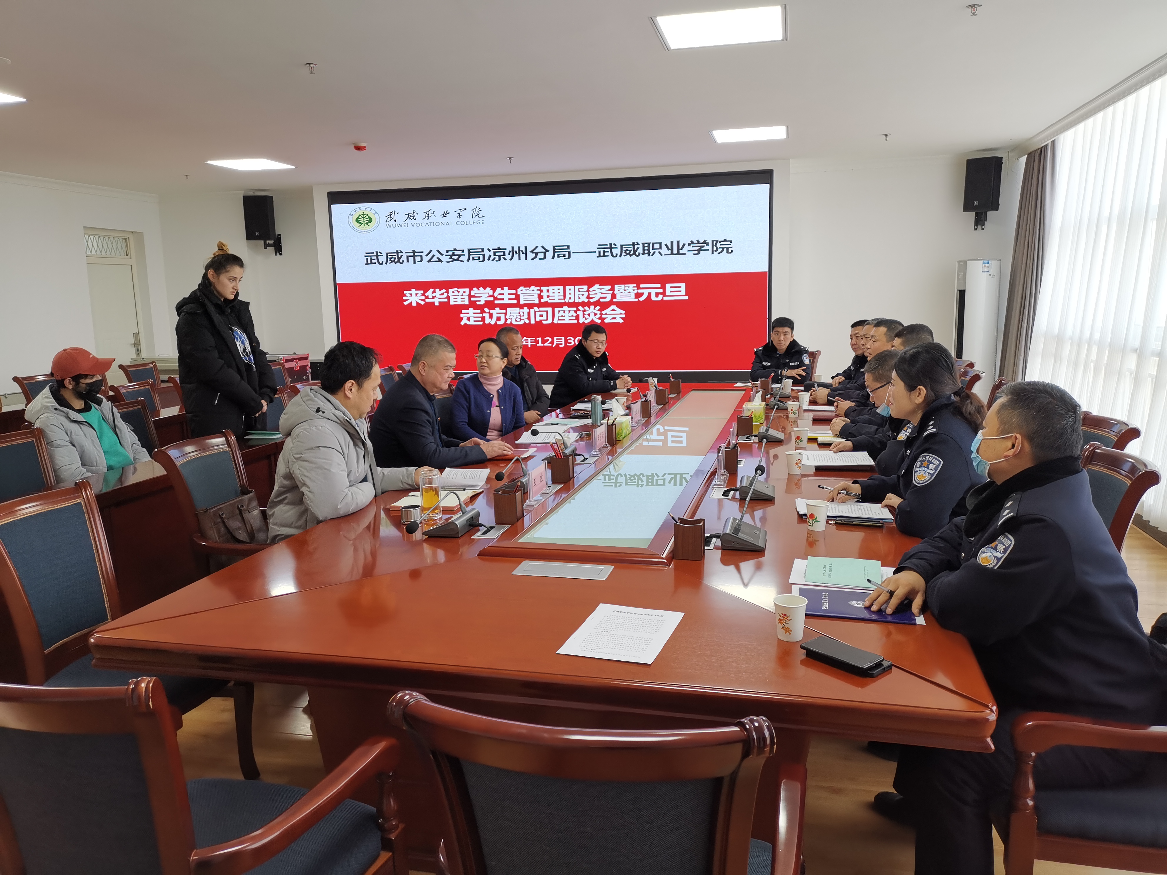12月30日上午,市公安局出入境管理科、非政府組織管理辦公室,市公安局涼州分局國(guó)安大隊(duì)、反恐大隊(duì)、出入境管理辦公室、涼州分局西關(guān)街派出所一行十一人到訪學(xué)院,開(kāi)展來(lái)華留學(xué)生管理服務(wù)暨元旦走訪慰問(wèn)活動(dòng)。黨委委員、副院長(zhǎng)田迎春、王守云出席活動(dòng)。國(guó)際合作與交流處處長(zhǎng)潘從民、保衛(wèi)處處長(zhǎng)王政及相關(guān)人員,2019級(jí)、2021級(jí)在華留學(xué)生參加活動(dòng)。田迎春主持活動(dòng)。