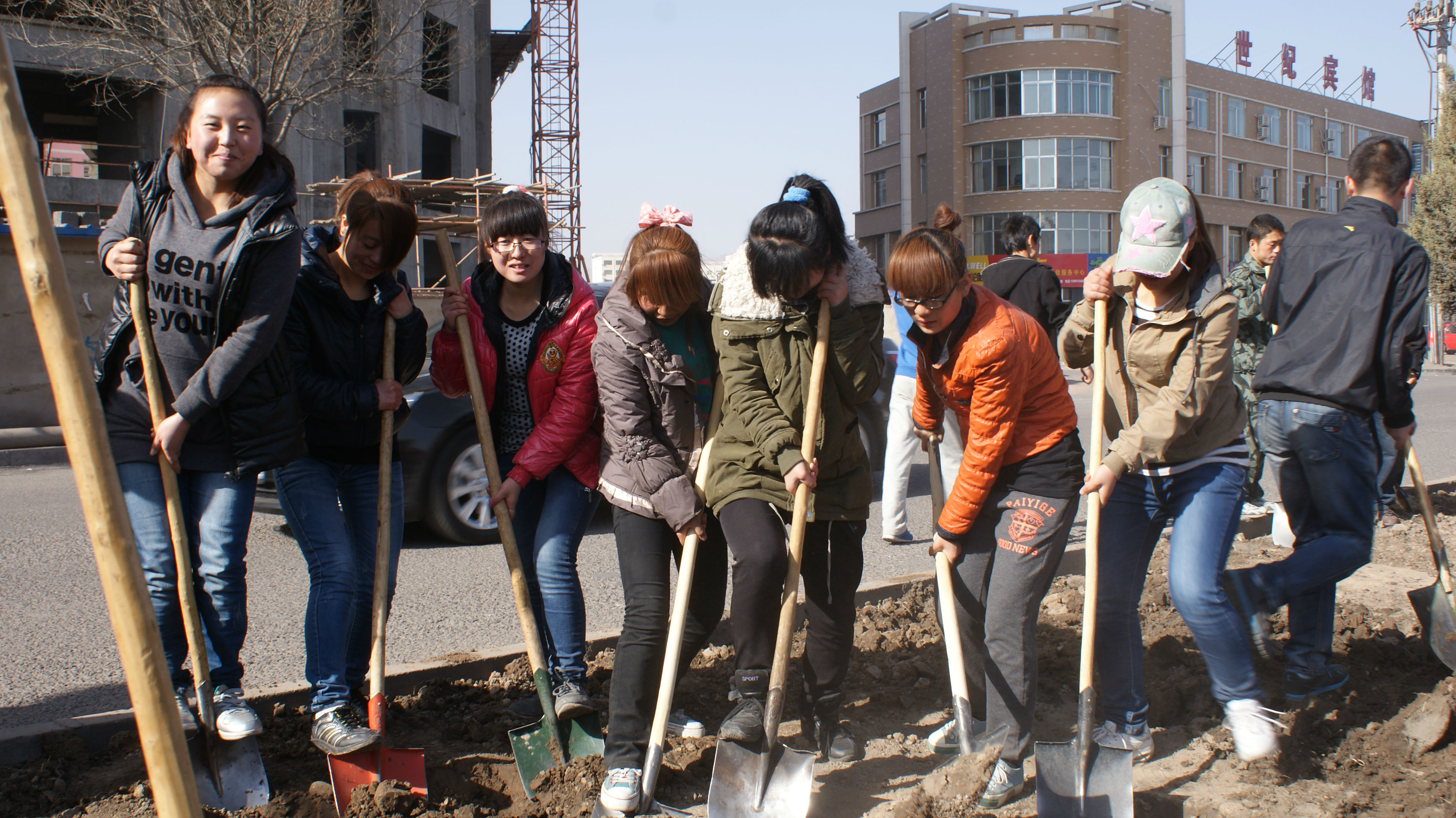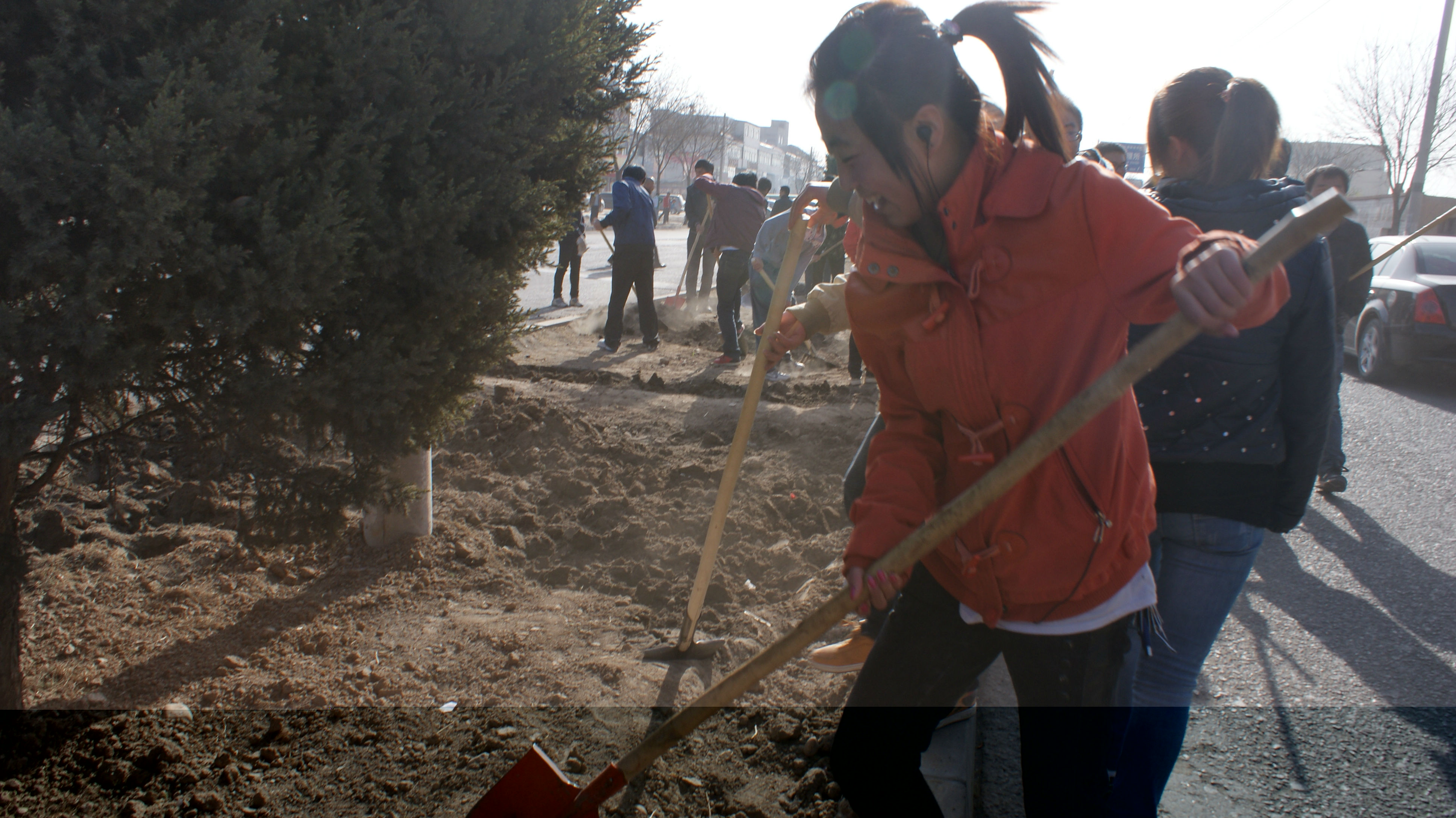 大家早早的來到了目的地,很快投入了植樹和凈化街道的隊(duì)伍中。同學(xué)們井然有序,手持鐵鍬,一鍬一鍬的鏟土,一片一片的清理大街,干勁十足。同學(xué)們無一不閃爍著汗珠,露出幸福的笑容。