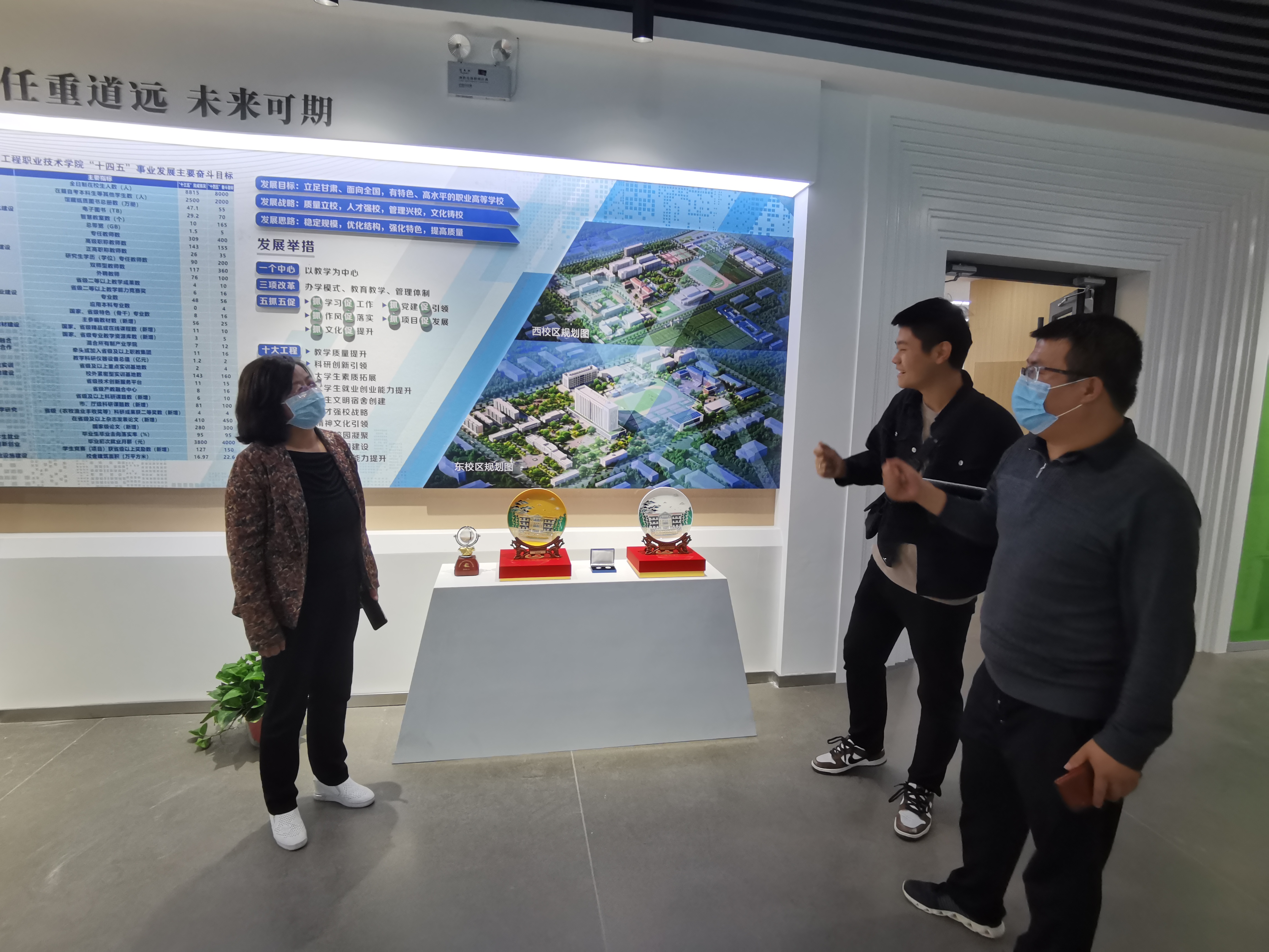 為全面推進(jìn)“雙高計(jì)劃”學(xué)校建設(shè),提升圖書館服務(wù)水平,營造“書香校園”,將圖書館打造成人性化、智能化、專業(yè)化的綠色學(xué)習(xí)空間。近日,圖書館館長楊如松、副館長蔡濟(jì)眾、館員楊建盛三人到甘肅省畜牧工程職業(yè)技術(shù)學(xué)院圖書館考察學(xué)習(xí),在甘肅省畜牧工程職業(yè)技術(shù)學(xué)院圖書館館長解玉寶陪同下,參觀了該校圖書館讀書吧、校史館、黨史館、“挑戰(zhàn)杯”獲獎(jiǎng)作品展覽館等處,解玉寶講解了該館設(shè)計(jì)理念及建設(shè)過程中的側(cè)重點(diǎn)和展示重點(diǎn)。楊如松就現(xiàn)在圖書館裝發(fā)展趨勢、圖書館管理辦法、學(xué)生借閱量等實(shí)際問題同解玉寶進(jìn)行了相互交流。