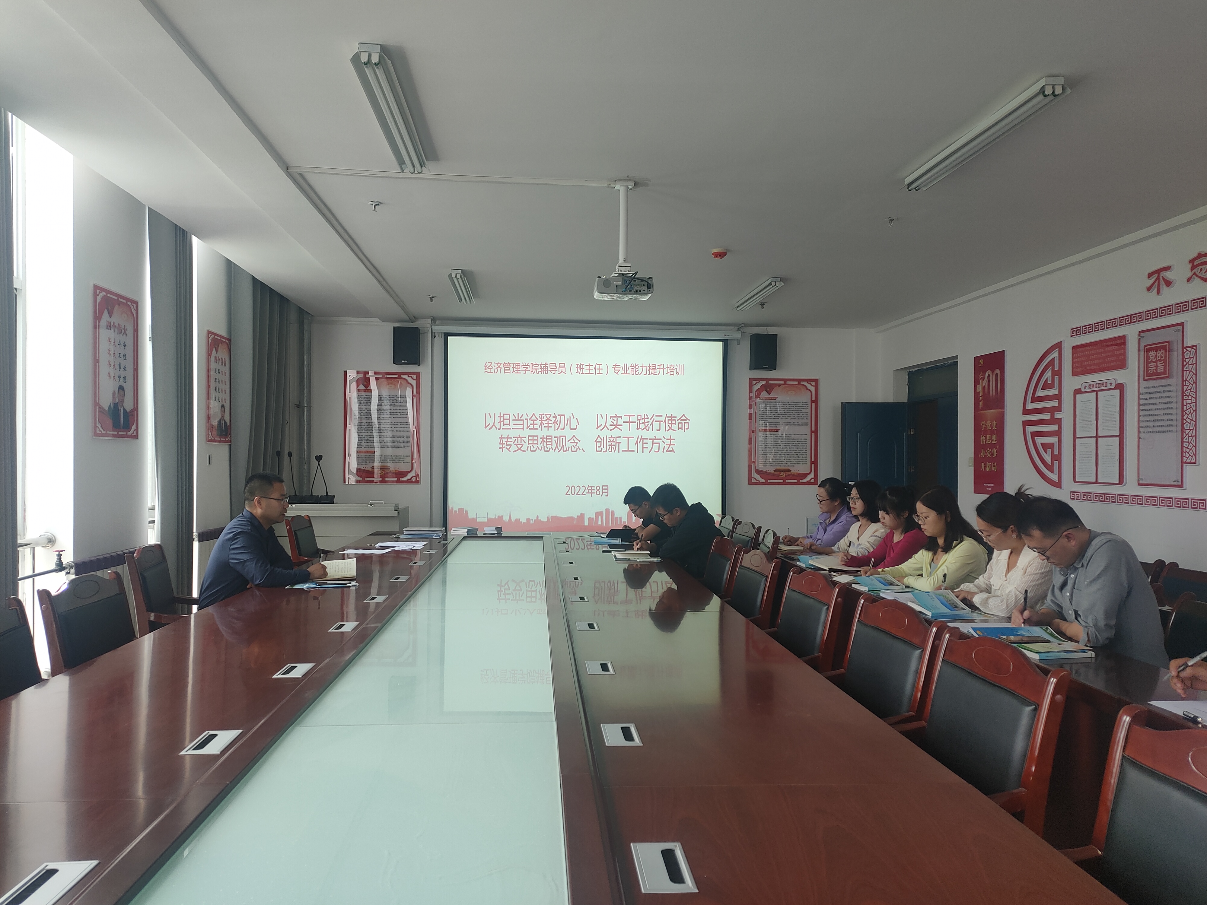 為提高學(xué)生管理水平,提升班主任隊(duì)伍整體素質(zhì),經(jīng)濟(jì)管理學(xué)院于8月30日在經(jīng)緯樓306會議室召開了“以擔(dān)當(dāng)詮釋初心 以實(shí)干踐行使命---——轉(zhuǎn)變思想觀念、創(chuàng)新工作方法”為主題的班主任專業(yè)能力提升培訓(xùn)會。會議由經(jīng)濟(jì)管理學(xué)院黨總支書記張伯成主持,全體班主任、輔導(dǎo)員參加了本次會議。