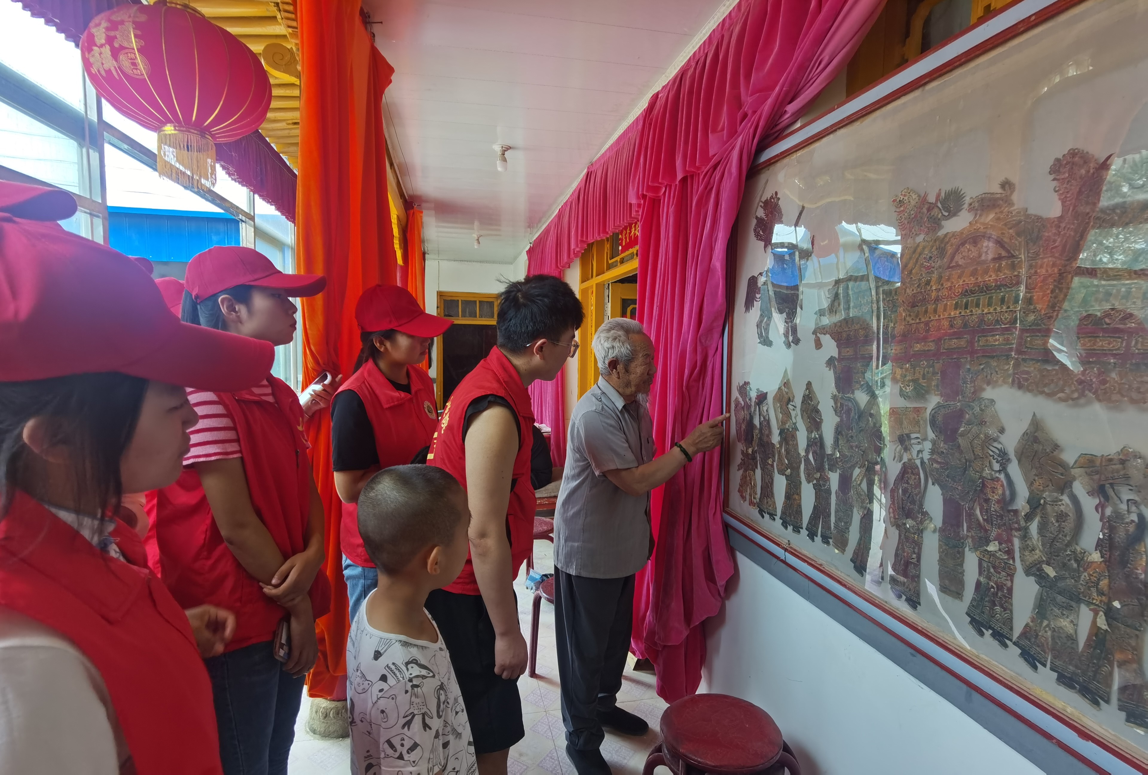 馬登岐老人為隊(duì)員們表演了一段經(jīng)典的皮影劇《黑虎坐臺(tái)》,方寸之間有天地,白紗帳前龍虎斗。一盞明燈影出一群紙偶,幾支竹竿撐起一方幕布,浮光掠影之間,所有的故事都在這方小小的幕布中演繹得淋漓盡致。