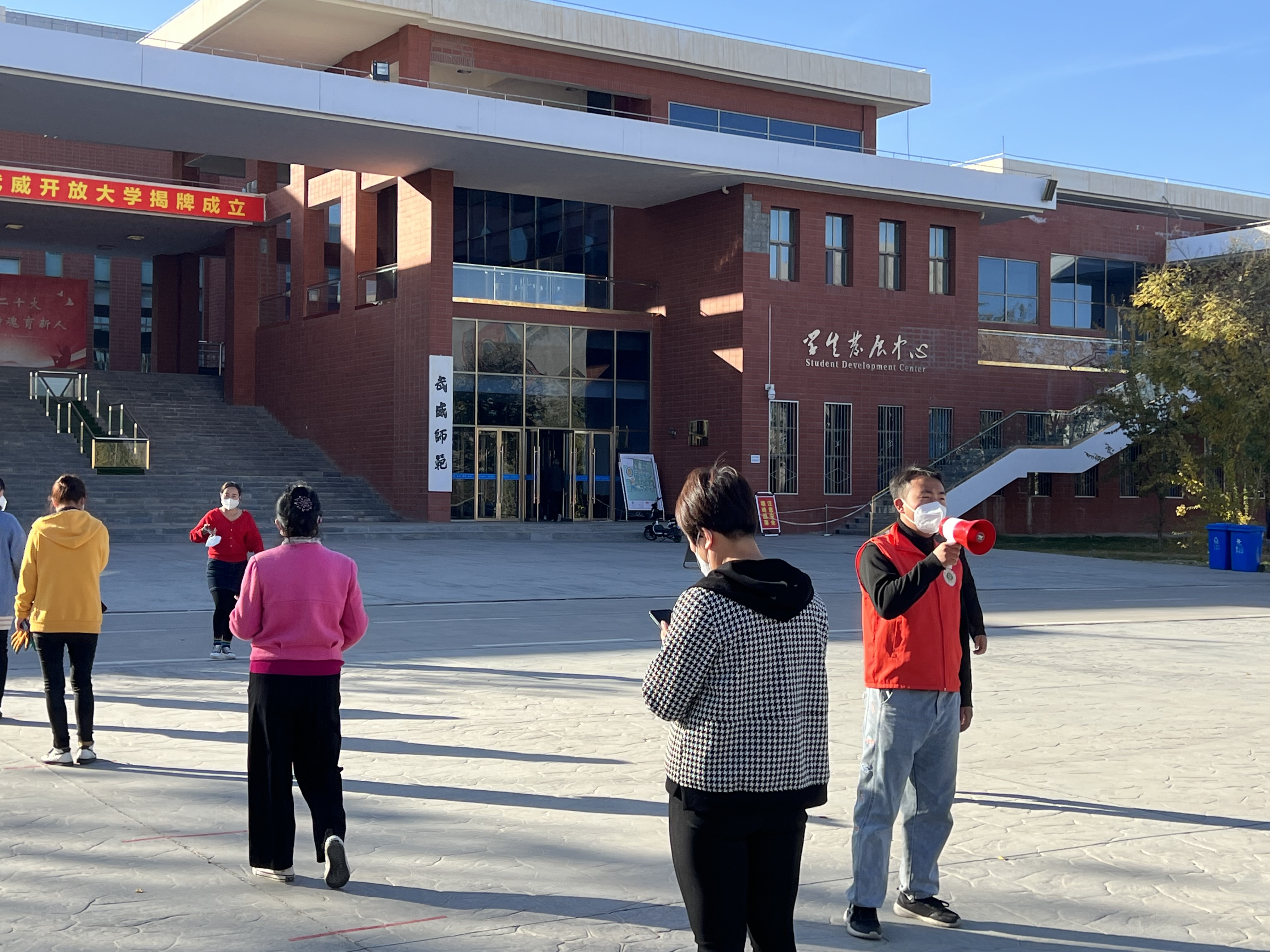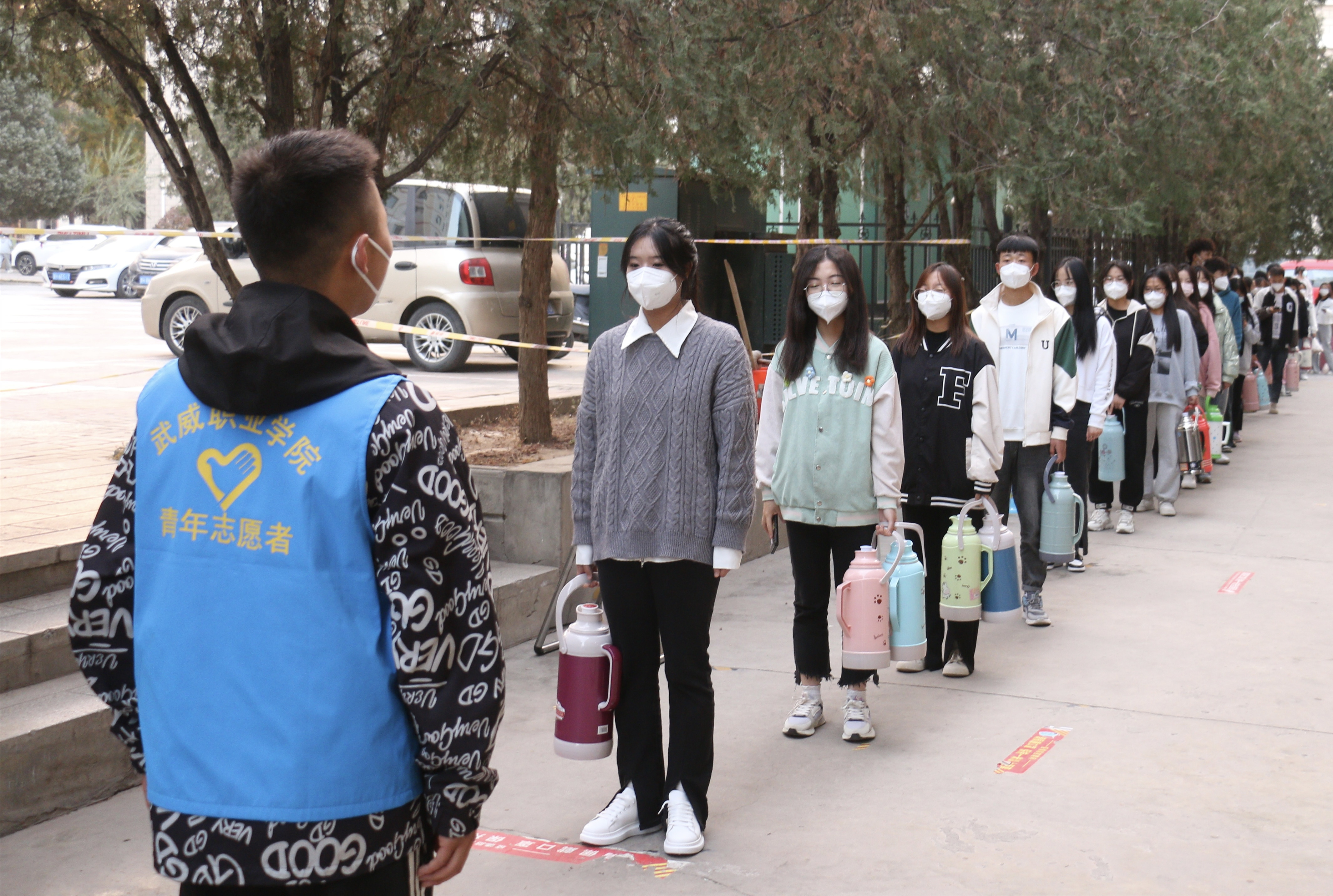 “您好,請(qǐng)測(cè)量體溫、掃場(chǎng)所碼?!薄罢?qǐng)佩戴好口罩,有序排隊(duì)……”校學(xué)生會(huì)的陶玲在學(xué)校食堂門口值班時(shí)不停地提醒著進(jìn)出打飯的同學(xué)們,這也是她參加校園疫情防控以來(lái)每天講得最多的話。自10月13日涼州區(qū)實(shí)施臨時(shí)管控以來(lái),學(xué)校各學(xué)生組織聞令而動(dòng),身穿“藍(lán)馬甲”積極投身校園疫情防控一線,用奉獻(xiàn)溫暖了這個(gè)秋天。