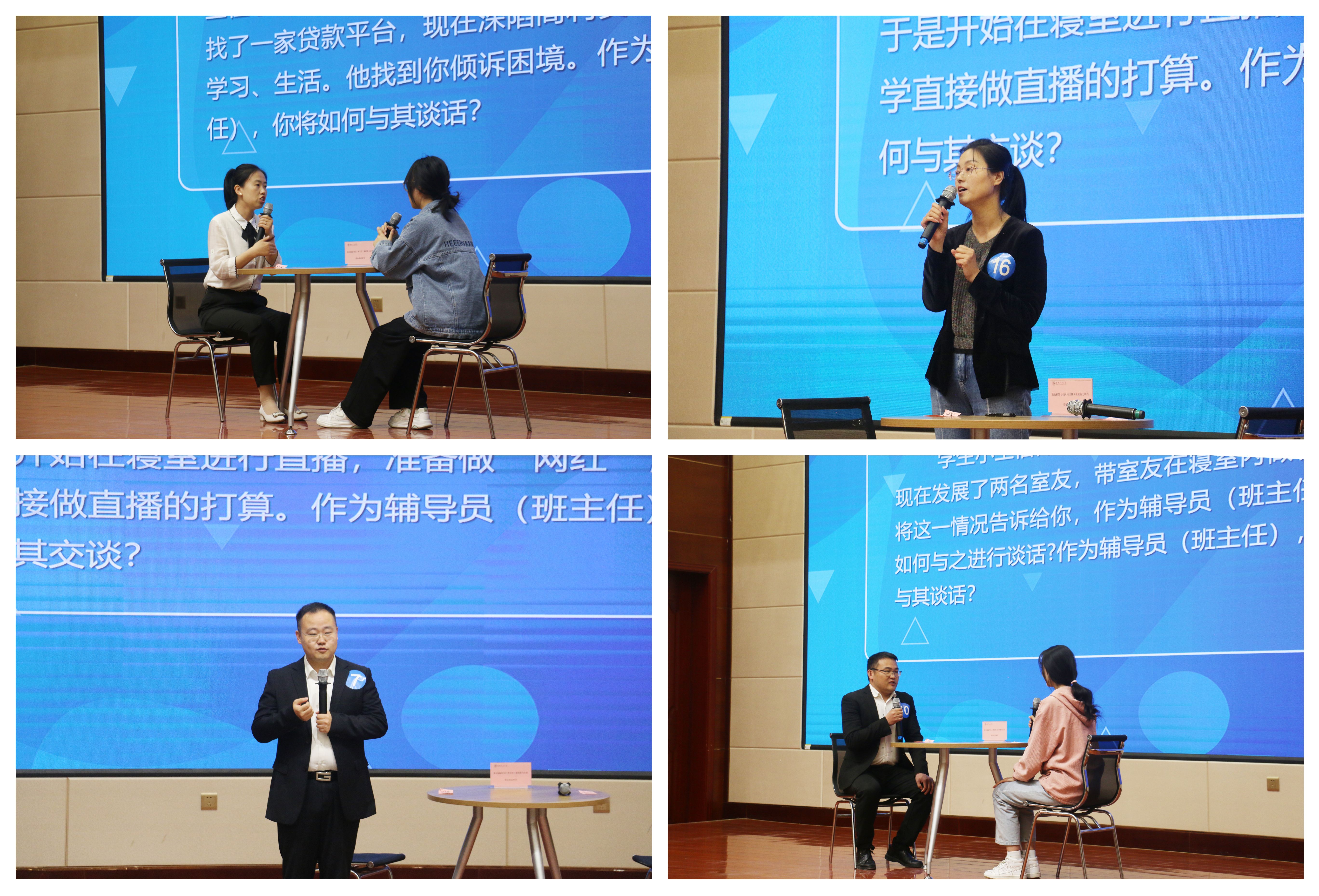 4月20日,談心談話環(huán)節(jié)在菁英廳進(jìn)行。比賽中,面對(duì)“問題百變”的參演學(xué)生,參賽選手從學(xué)生特征、學(xué)生成長(zhǎng)、成才規(guī)律等方面進(jìn)行了耐心、細(xì)致的談心談話,充分展示了輔導(dǎo)員、班主任對(duì)學(xué)生的教育引導(dǎo)、解決思想困惑和處理實(shí)際問題的能力。