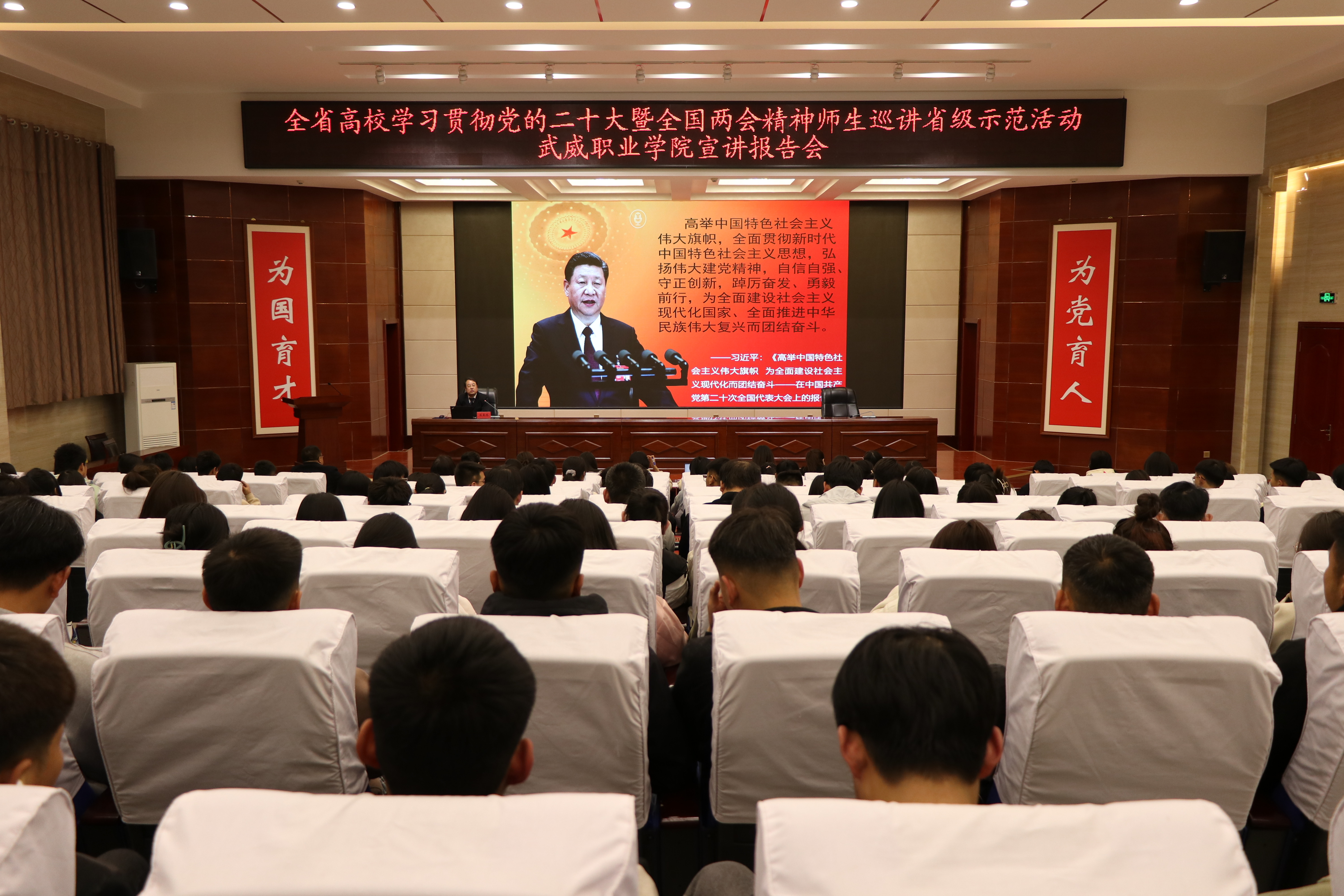 4月23日下午,省委教育工委“逐夢(mèng)新征程 奮斗創(chuàng)未來(lái)”全省高校學(xué)習(xí)貫徹黨的二十大暨全國(guó)兩會(huì)精神師生巡講省級(jí)示范活動(dòng),第五巡講團(tuán)來(lái)我校開(kāi)展宣講。第五巡講團(tuán)組長(zhǎng)、蘭州交通大學(xué)馬克思主義學(xué)院蘇星鴻教授,作了專(zhuān)題報(bào)告。學(xué)校宣傳統(tǒng)戰(zhàn)部全體成員、馬克思主義學(xué)院全體教師、各二級(jí)學(xué)院學(xué)生代表共計(jì)200余人聆聽(tīng)了巡講報(bào)告。