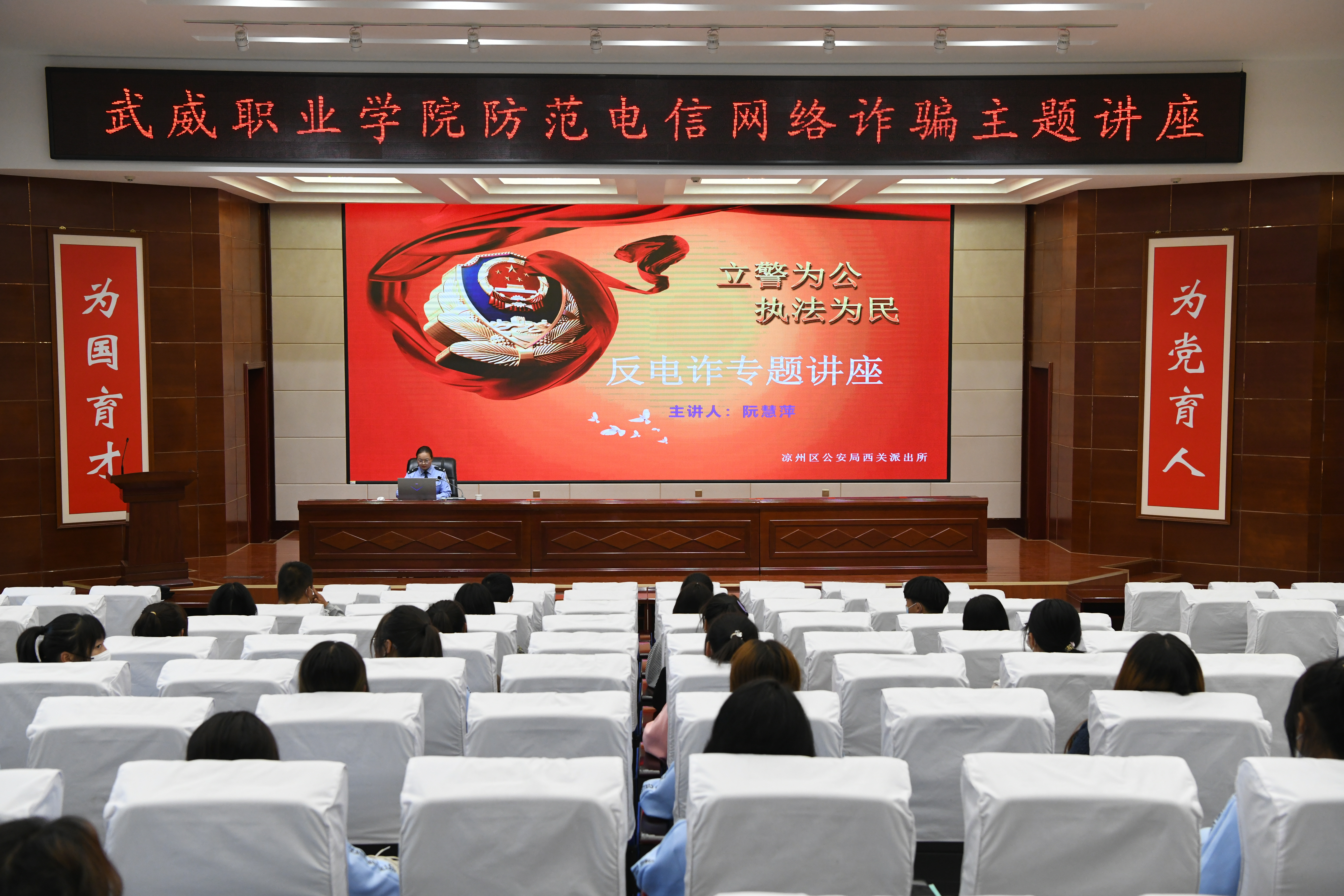 為了提高學(xué)校師生識(shí)別和防范電信網(wǎng)絡(luò)詐騙的能力,切實(shí)做好防范電信網(wǎng)絡(luò)詐騙宣傳教育工作。9月30日,學(xué)校聯(lián)合武威市公安局涼州分局西關(guān)派出所在學(xué)生發(fā)展中心菁英廳舉辦防范電信網(wǎng)絡(luò)詐騙專(zhuān)題講座。各二級(jí)學(xué)院師生代表聆聽(tīng)了講座,講座由安全保衛(wèi)處負(fù)責(zé)人李欣主持。