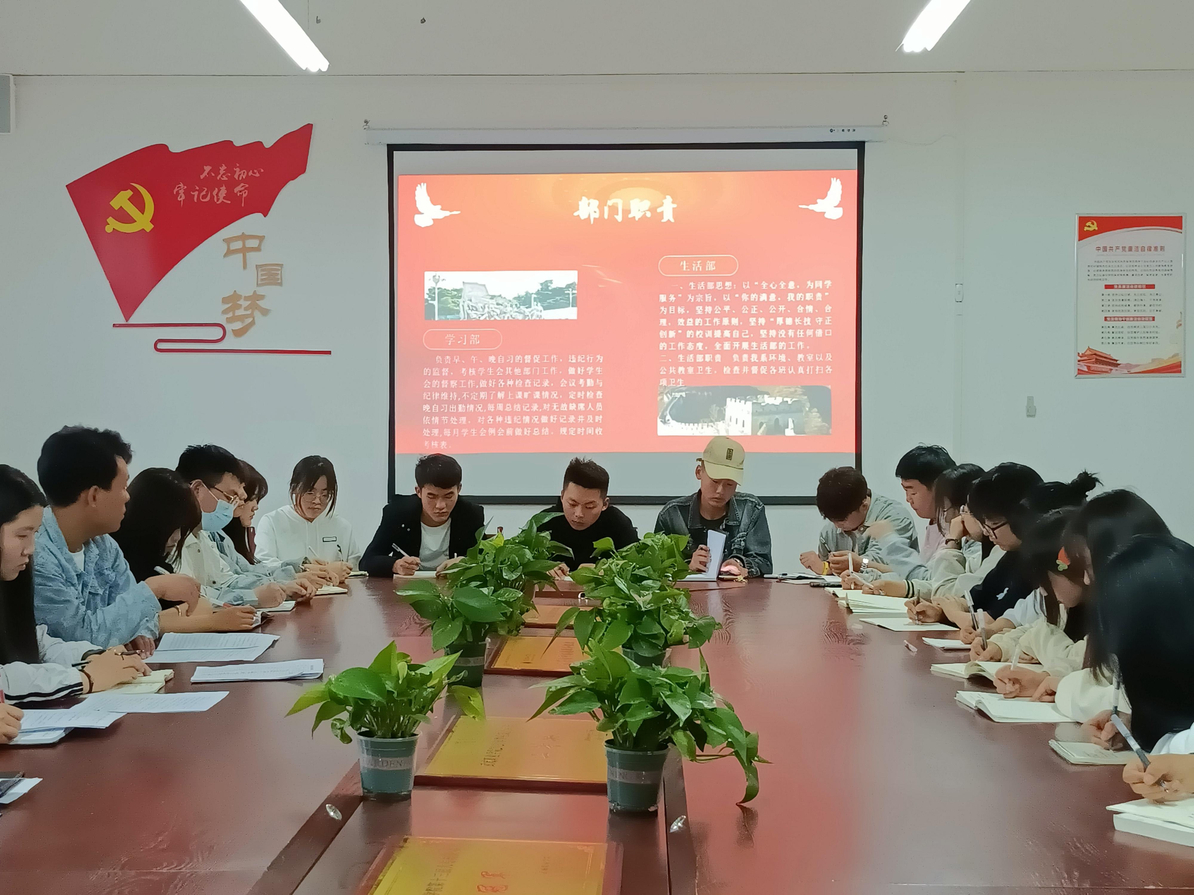 ? ? ? ? ??? ? ? ?會(huì)議第二項(xiàng)由胡瑞琪講述學(xué)生例會(huì)制度,為了更好的服務(wù)同學(xué),每次例會(huì)都會(huì)實(shí)行考勤制度,由各部長向主席團(tuán)匯報(bào)本周的工作情況,再由主席團(tuán)向輔導(dǎo)員匯報(bào)本周問題,并安排下周工作。接著我院主席團(tuán)成員尚寶萍表達(dá)了對團(tuán)學(xué)工作的充分肯定和支持,同時(shí)也提出了幾點(diǎn)工作的不足。各部門部長也更加詳細(xì)的對工作內(nèi)容進(jìn)行了的介紹。??
