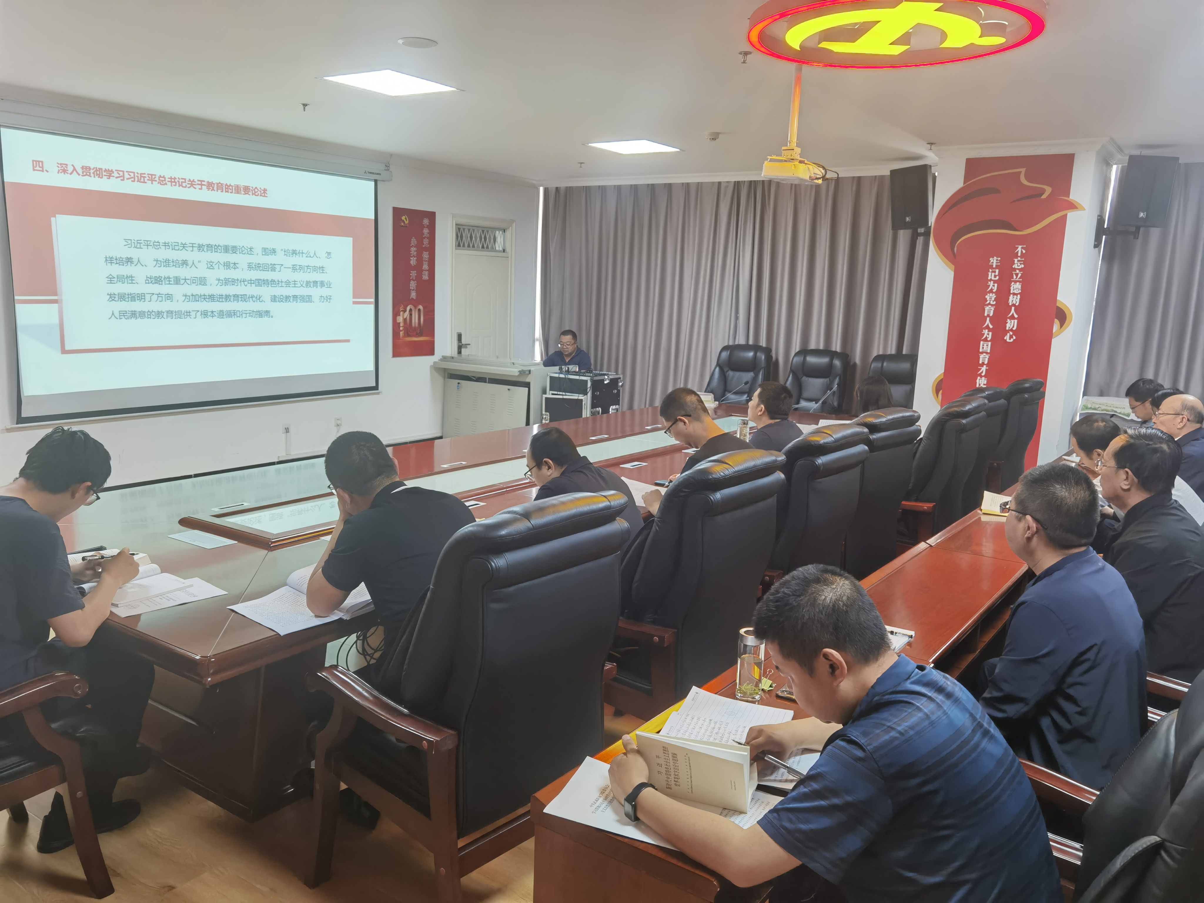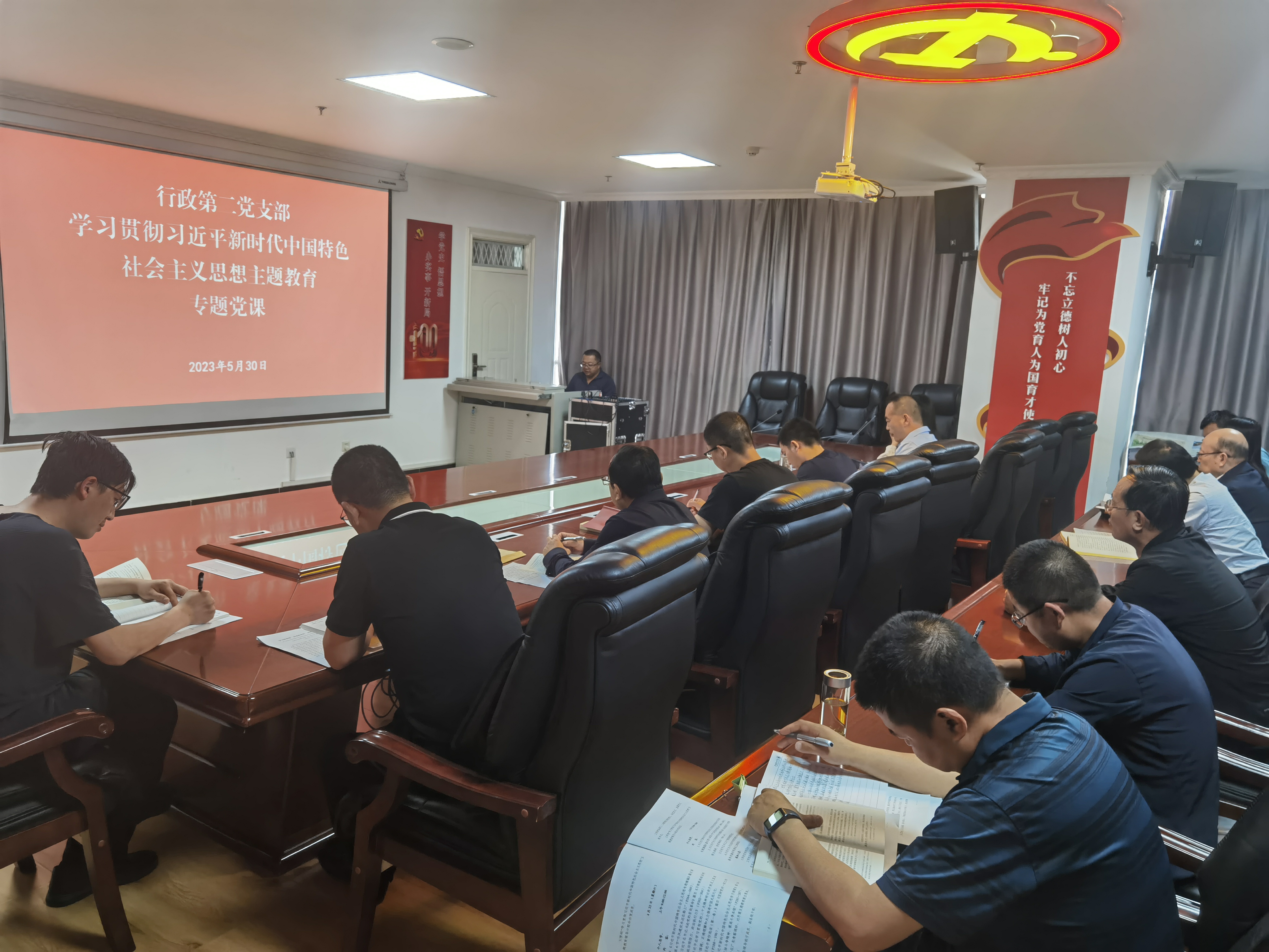 5月30日下午,行政第二黨支部書記魏全民在810會議室以《學(xué)習(xí)新思想 奮進新征程 建功新時代》為題,并結(jié)合個人學(xué)思踐悟和教育教學(xué)工作實際,講授學(xué)習(xí)貫徹習(xí)近平新時代中國特色社會主義思想主題教育專題黨課,行政第二黨支部全體黨員參加。