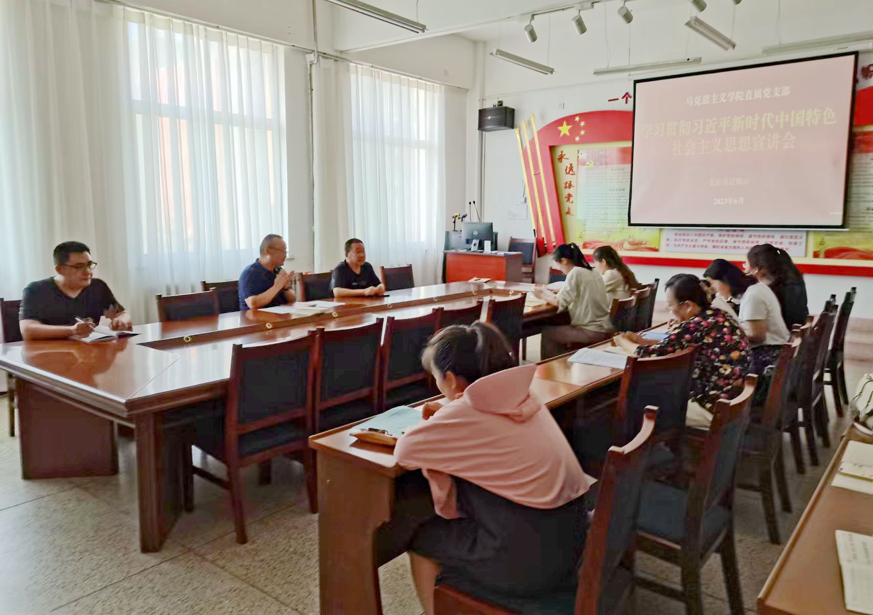 為推動學習貫徹習近平新時代中國特色社會主義思想主題教育走深走實,教育引導教師全面學習、深刻領會、準確把握習近平新時代中國特色社會主義思想,按照學校宣講工作部署,6月29日,馬克思主義學院黨支部開展了學習貫徹習近平新時代中國特色社會主義思想主題教育專題宣講活動,黨支部書記劉心作宣講,支部全體黨員參加活動。