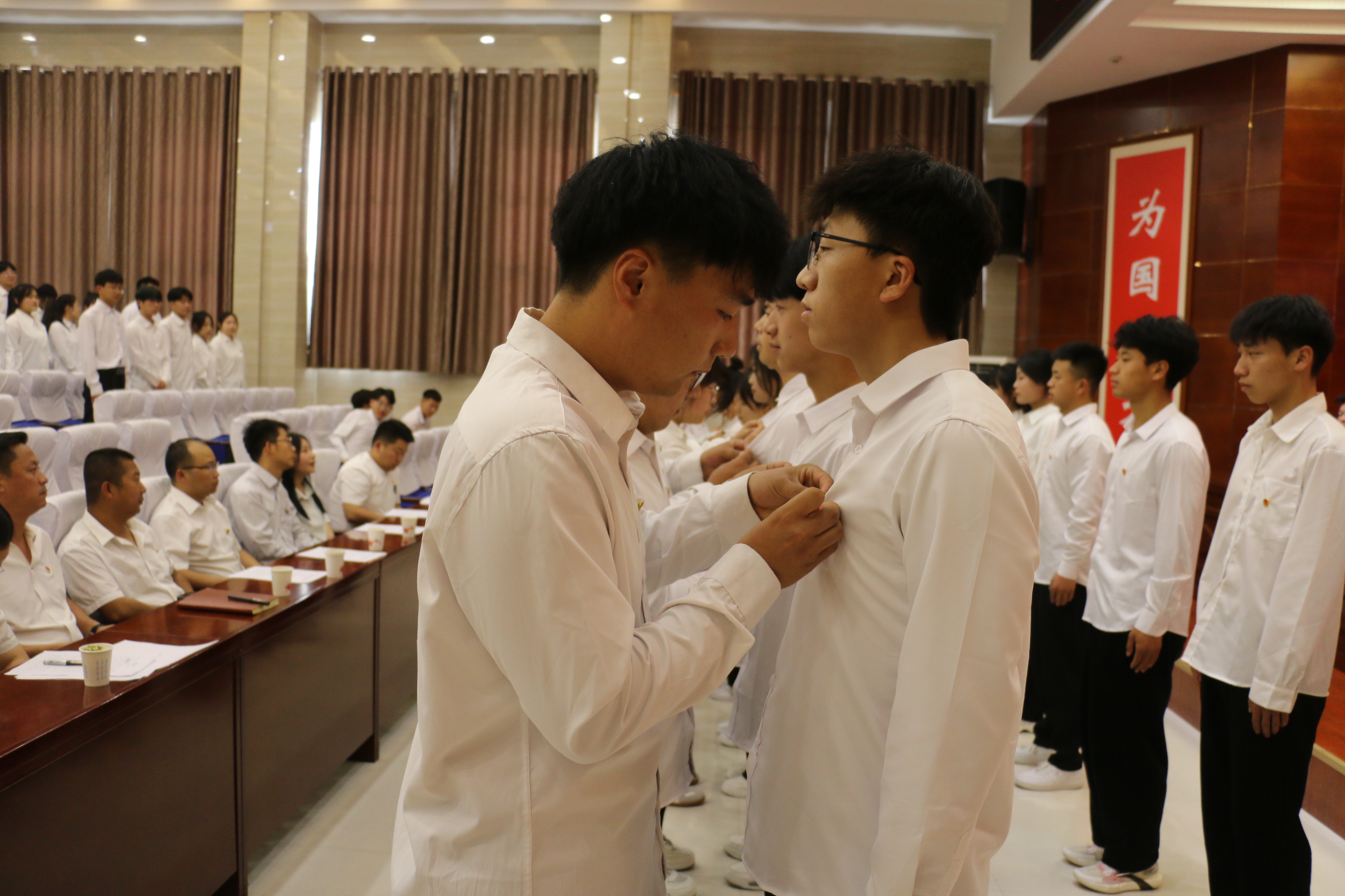 入團(tuán)儀式上,校團(tuán)委相關(guān)負(fù)責(zé)人宣讀了128名新團(tuán)員名單,并向新團(tuán)員闡釋了團(tuán)徽的組成及象征意義。老團(tuán)員代表為新團(tuán)員代表佩戴了團(tuán)徽,全體團(tuán)員面對(duì)鮮艷的團(tuán)旗,進(jìn)行了莊嚴(yán)的宣誓。