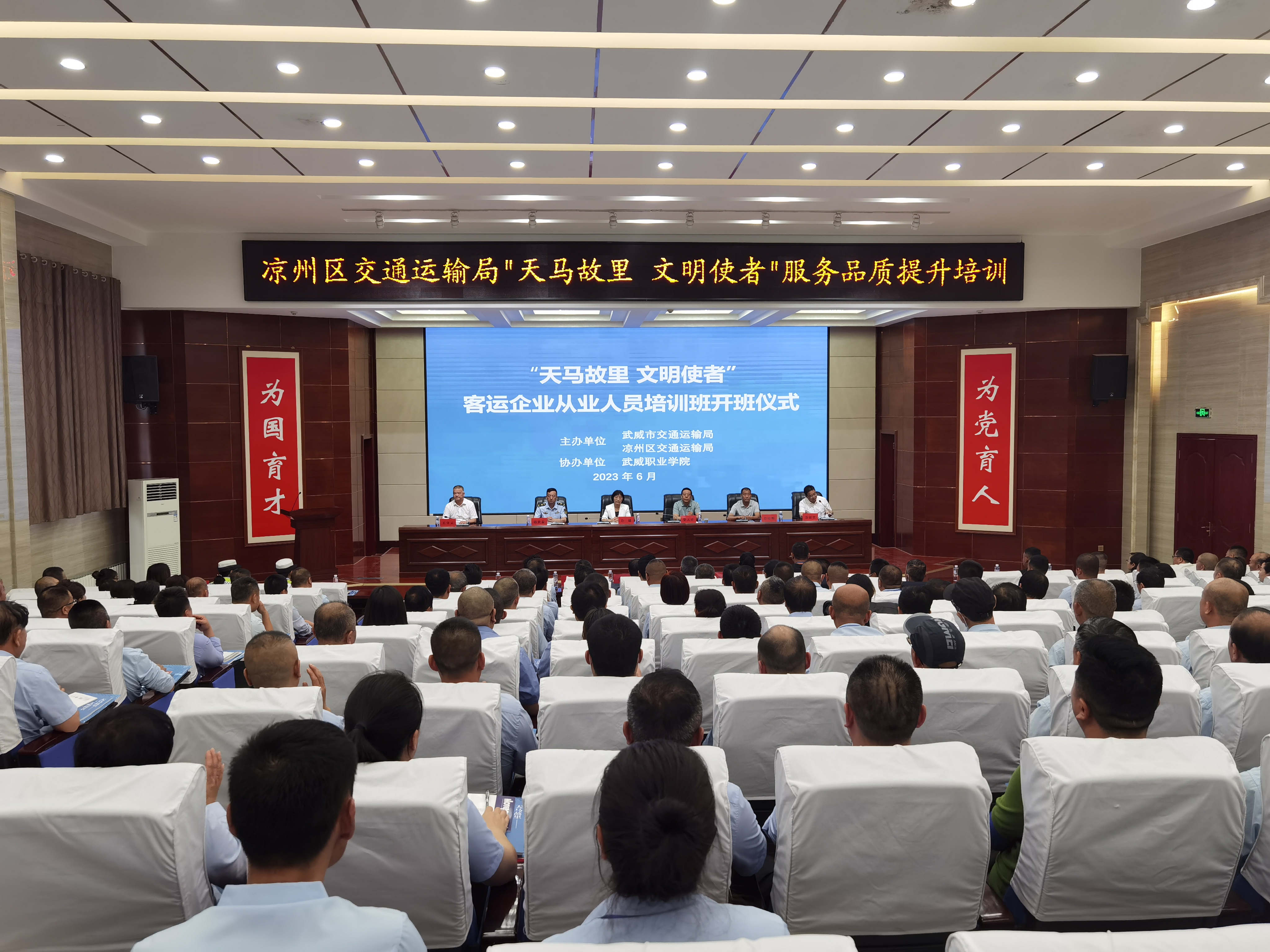 6月28日,“天馬故里 文明使者”客運企業(yè)從業(yè)人員服務(wù)品質(zhì)提升培訓(xùn)班在武威職業(yè)學(xué)院開班。市交通局副局長柴天祥,區(qū)委常委、統(tǒng)戰(zhàn)部部長、區(qū)政協(xié)黨組書記許娜,市交通運輸綜合行政執(zhí)法隊隊長韓世泰,市運管局副局長許培明,學(xué)校黨委委員、副校長王守云出席開班儀式。開班式由涼州區(qū)交通運輸局副局長蘇銀堂主持,出租客運公司、城市公交公司和定制客運公司管理人員及從業(yè)人員220人參加開班儀式。