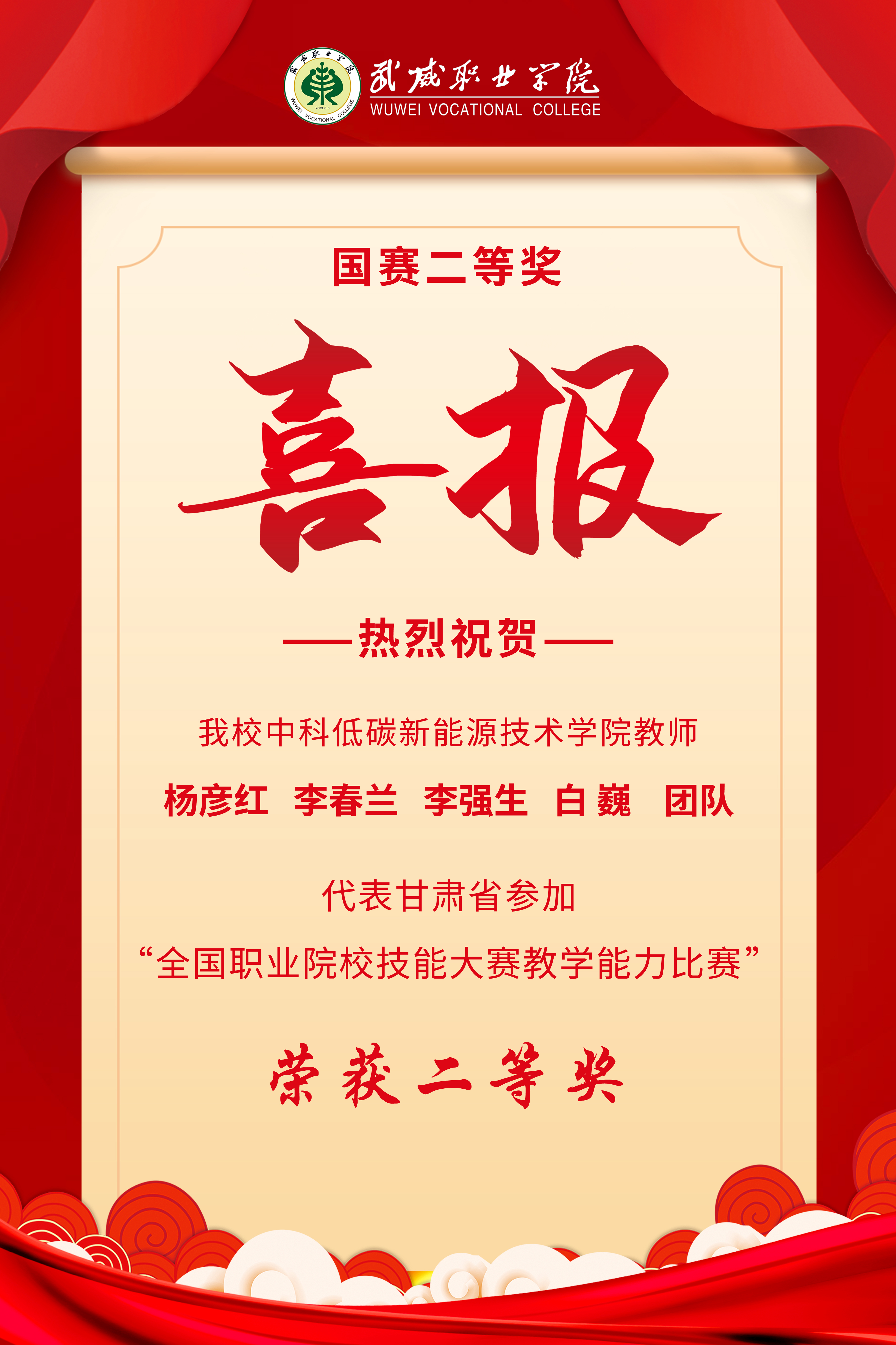 11月23-25日,2023年全國職業(yè)院校技能大賽教學(xué)能力比賽決賽在江西現(xiàn)代職業(yè)技術(shù)學(xué)院舉行,由我校中科低碳新能源學(xué)院教師楊彥紅、李強(qiáng)生、李春蘭、白巍組成的參賽團(tuán)隊(duì)代表甘肅省參加比賽,喜獲二等獎(jiǎng)。