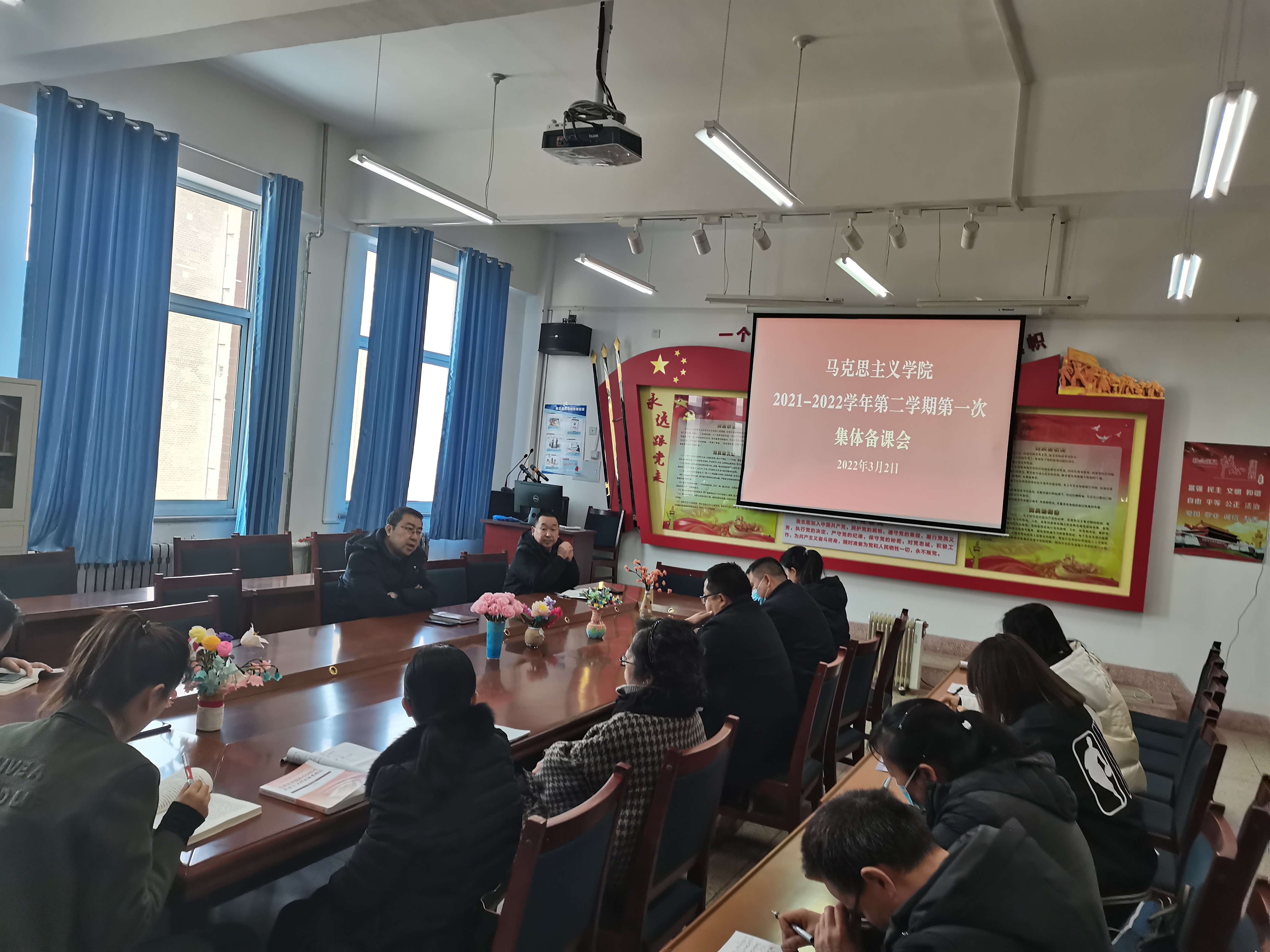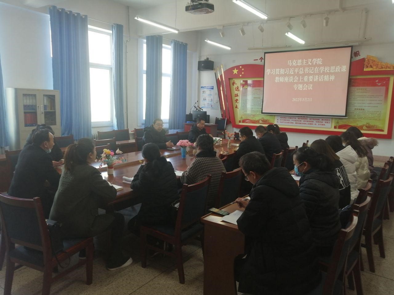 2022年正值習(xí)近平總書記3.18重要講話三周年,為貫徹落實學(xué)院黨委《關(guān)于做好習(xí)近平總書記在學(xué)校思政課教師座談會上重要講話精神貫徹落實情況全面總結(jié)宣傳工作的通知》精神,3月2日下午,馬克思主義學(xué)院在勵勤樓209會議室,召開學(xué)習(xí)貫徹習(xí)近平總書記在學(xué)校思政課教師座談會上重要講話精神學(xué)習(xí)總結(jié)備課會暨2021-2022學(xué)年第2學(xué)期《毛澤東思想和中國特色社會主義理論體系概論》課程教學(xué)集體備課會,會議由馬克思主義學(xué)院院長胡靜峰主持,全體專兼職思政課教師參加了會議。