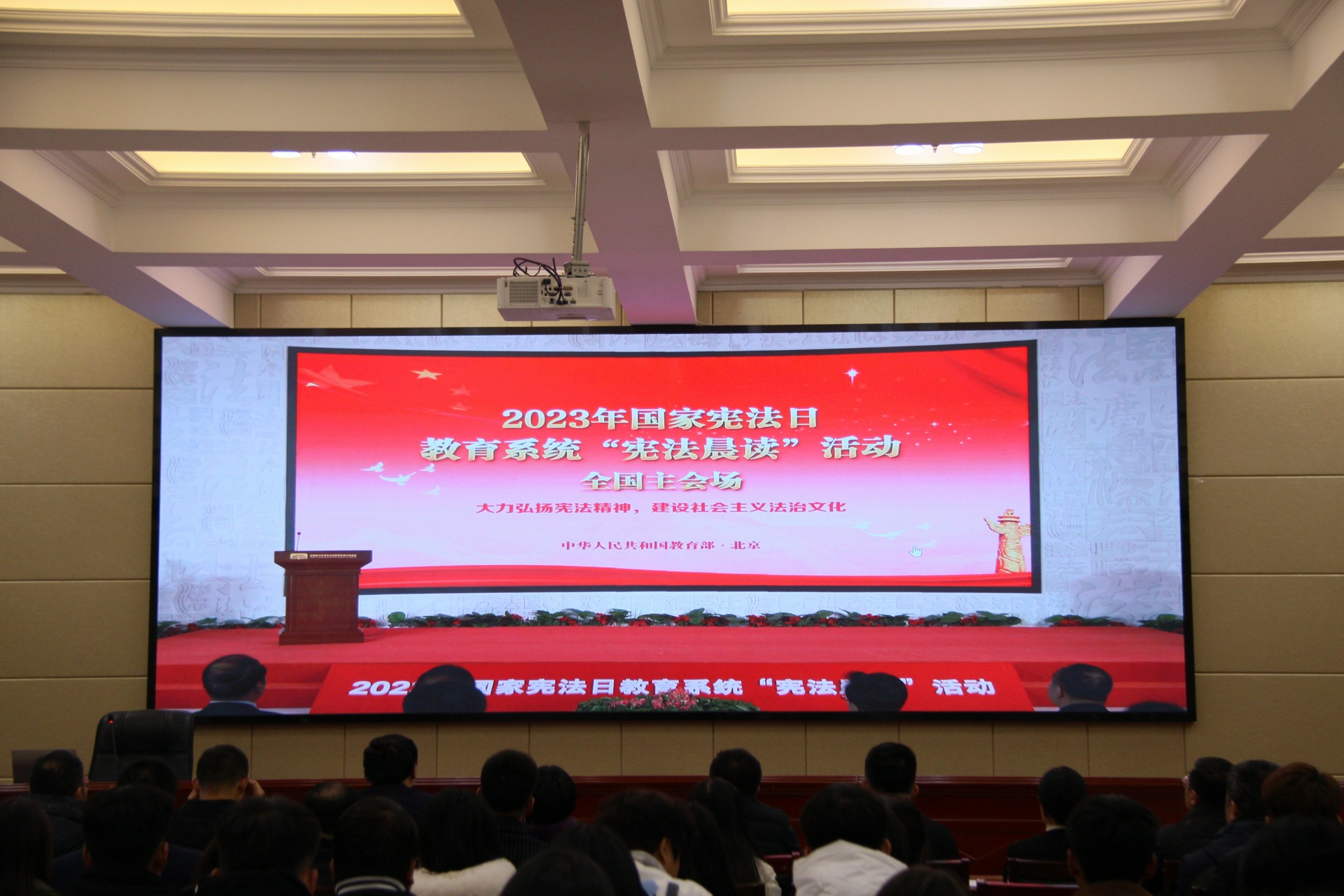 2023年12月4日是第十個(gè)國家憲法日,為深入學(xué)習(xí)貫徹黨的二十大精神,貫徹落實(shí)習(xí)近平法治思想和習(xí)近平總書記關(guān)于憲法法治教育的重要指示精神,營造法治校園氛圍,弘揚(yáng)憲法精神,維護(hù)憲法權(quán)威,培育學(xué)生的憲法意識(shí)、國家意識(shí)、規(guī)則意識(shí)。學(xué)校在行樹樓北報(bào)告廳開展“大力弘揚(yáng)憲法精神,建設(shè)社會(huì)主義法治文化”憲法晨讀活動(dòng)。黨委委員、副校長何毅參加活動(dòng)。