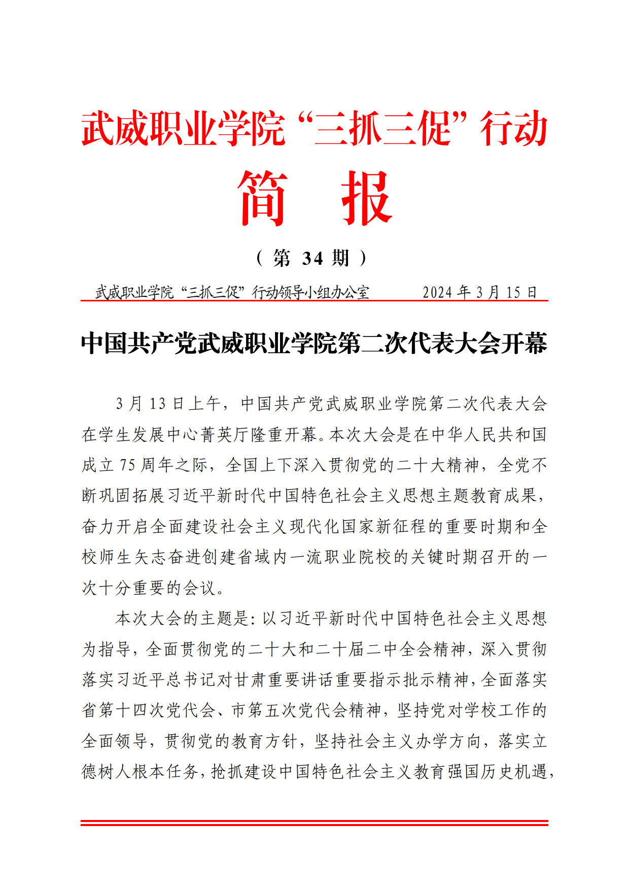 簡報第34期:中國共產(chǎn)黨武威職業(yè)學(xué)院第二次代表大會開幕