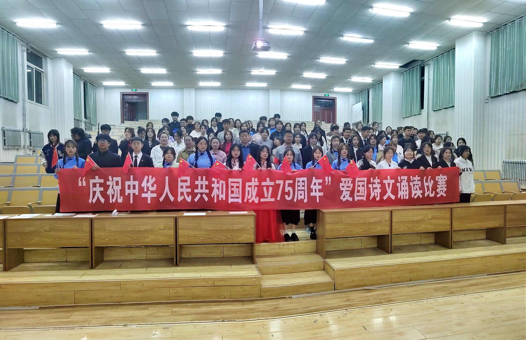 為慶祝中華人民共和國成立75周年,3月28日,武威職業(yè)學(xué)院藥學(xué)院在正德廳舉行了以“慶祝中華人民共和國成立75周年”為主題的愛國詩文誦讀比賽。武威職業(yè)學(xué)院全院共13個(gè)參賽隊(duì)參加,武威職業(yè)學(xué)院藥學(xué)院學(xué)生工作負(fù)責(zé)人魏曙光、團(tuán)委書記楊琨、輔導(dǎo)員魯倩林、武威職業(yè)學(xué)院全體班主任及150余名學(xué)生代表共同觀看了比賽。