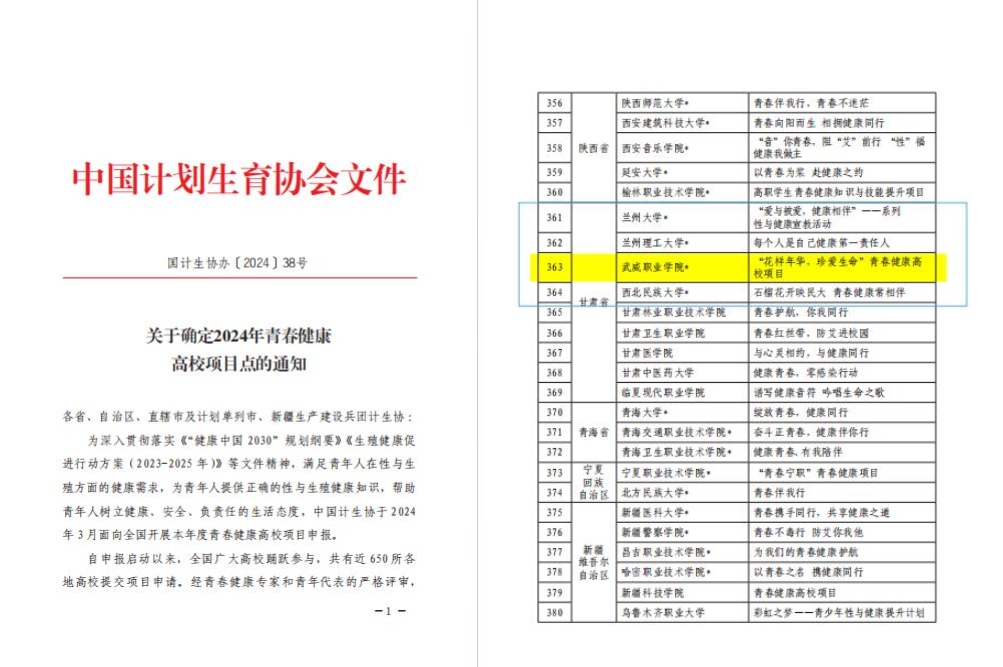 日前,中國計劃生育協(xié)會發(fā)布《關(guān)于確定2024年青春健康高校項目點的通知》,我校學(xué)生工作部、校團委、護理學(xué)院共同申報的“花樣年華,珍愛生命”項目,從全國各地500余所高校中脫穎而出,自2022年以來連續(xù)三次成功中標中國計生協(xié)專項資助A類項目,成為甘肅省中標A類項目院校中唯一一所高職院校。