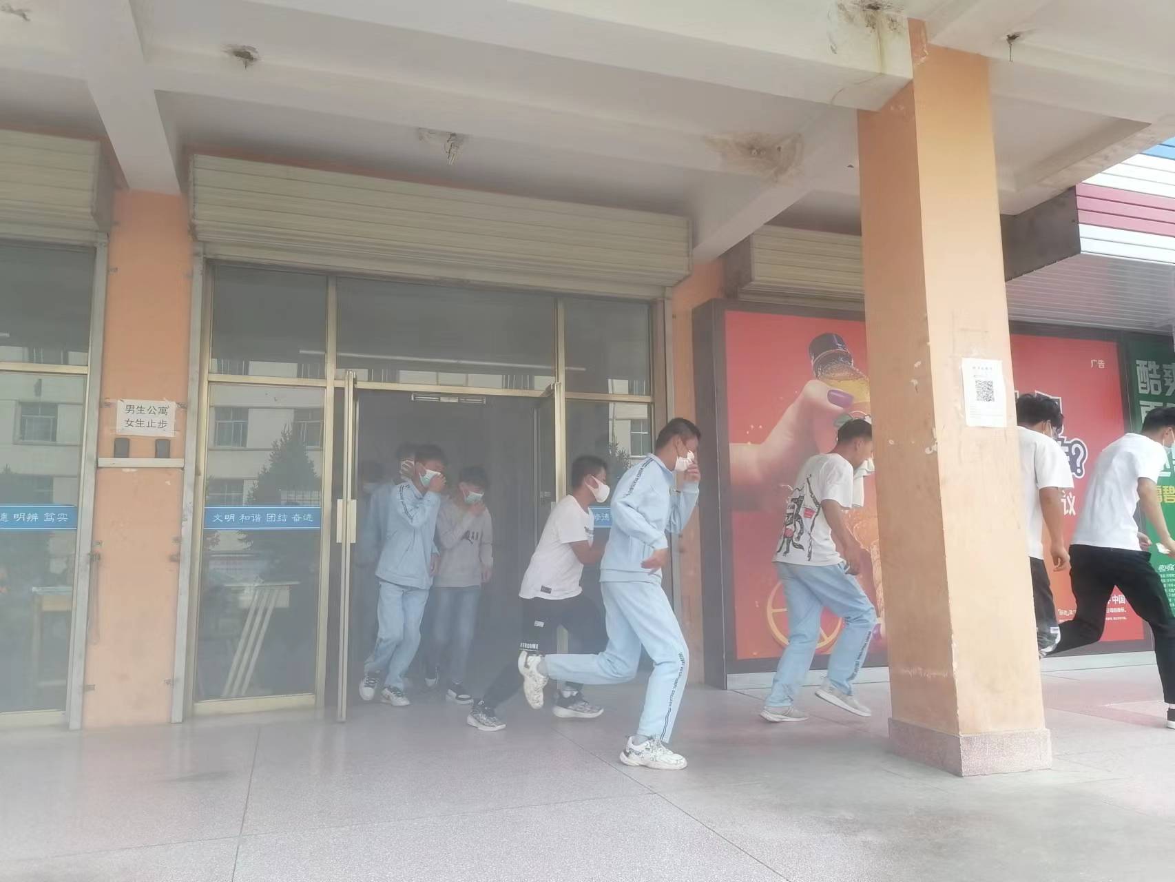 15時(shí)20分,疏散演練正式開始。隨著火災(zāi)警報(bào)響起,安全保衛(wèi)工作人員點(diǎn)燃煙餅,在學(xué)生公寓樓模擬火災(zāi)現(xiàn)場,冒出滾滾濃煙,公寓管理人員迅速組織學(xué)生有序疏散。在輔導(dǎo)員、班主任的引導(dǎo)下,同學(xué)們按照動(dòng)作要領(lǐng),用濕毛巾捂住口鼻,俯身彎腰按照安全出口指示牌快速、有序從疏散通道撤離到體育場,整個(gè)過程緊張有序,實(shí)用性強(qiáng),達(dá)到了預(yù)期效果。