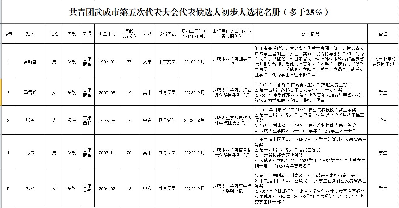 綜合考察結(jié)果及初步人選25%差額比例要求,經(jīng)武威職業(yè)學院團委研究,并報請學校黨委同意,擬定高鵬堂等5名同志為共青團武威市第五次代表大會代表候選人初步人選,現(xiàn)予以公示。