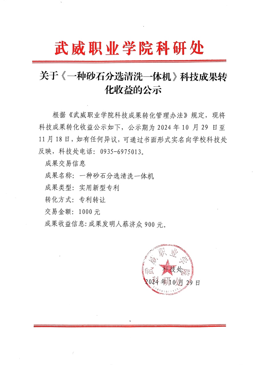 關(guān)于《一種砂石分選清洗一體機》科技成果轉(zhuǎn)化收益的公示