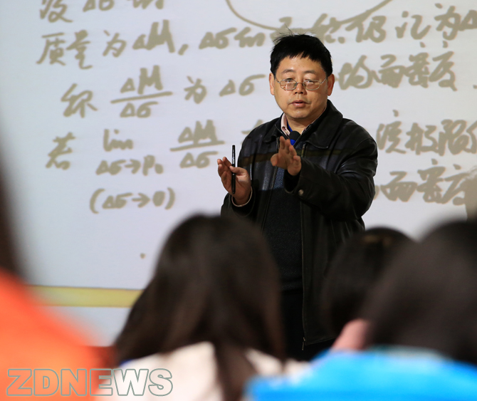現(xiàn)在,蘇德礦上課用兩個(gè)話筒,一個(gè)掛在脖子上,一個(gè)放在講臺(tái)上,無論學(xué)生坐在哪個(gè)角落,都能聽得清楚。他還像一個(gè)“舞臺(tái)監(jiān)督”一樣嚴(yán)格布置環(huán)境:教室第一排的窗簾必須拉上,以免大屏幕反光;幻燈片的紙片要用油性筆書寫,這樣投影到屏幕上的效果最清晰。——這樣的布局,就是能為學(xué)生能穩(wěn)定他們的注意力設(shè)計(jì)的,特別是,當(dāng)他們感覺“犯難”時(shí),蘇德礦能適時(shí)拋上一個(gè)“段子”,把學(xué)生分散的注意力拉回來: “當(dāng)你喜歡一個(gè)人,他的一點(diǎn)變化你都看在眼里,別人都變成了常數(shù),TA才是唯一變量。” 這是在講解偏導(dǎo)函數(shù);他還用“存錢存銀行還是存余額寶”來解釋函數(shù)里的重要極限概念。在講一元復(fù)合函數(shù)求導(dǎo)的時(shí)候,他用來解釋的例子是:“就像最近來天氣突然熱起來,你要脫衣服。脫到怎樣合適呢?一件一件脫,到不熱了為止。復(fù)合函數(shù)也一樣,一層一層求導(dǎo),直到內(nèi)函數(shù)的導(dǎo)數(shù)有公式,就成了。”又比如,說“開車為什么會(huì)撞樹?因?yàn)槌髽涞姆较?,再一個(gè),就是車速太快。”蘇德礦先賣個(gè)了關(guān)子,接著把方向?qū)?shù)亮出來,“在P點(diǎn)沿L方向的函數(shù)值的變化率,跟撞樹一樣,一個(gè)是方向,一個(gè)是速度。”