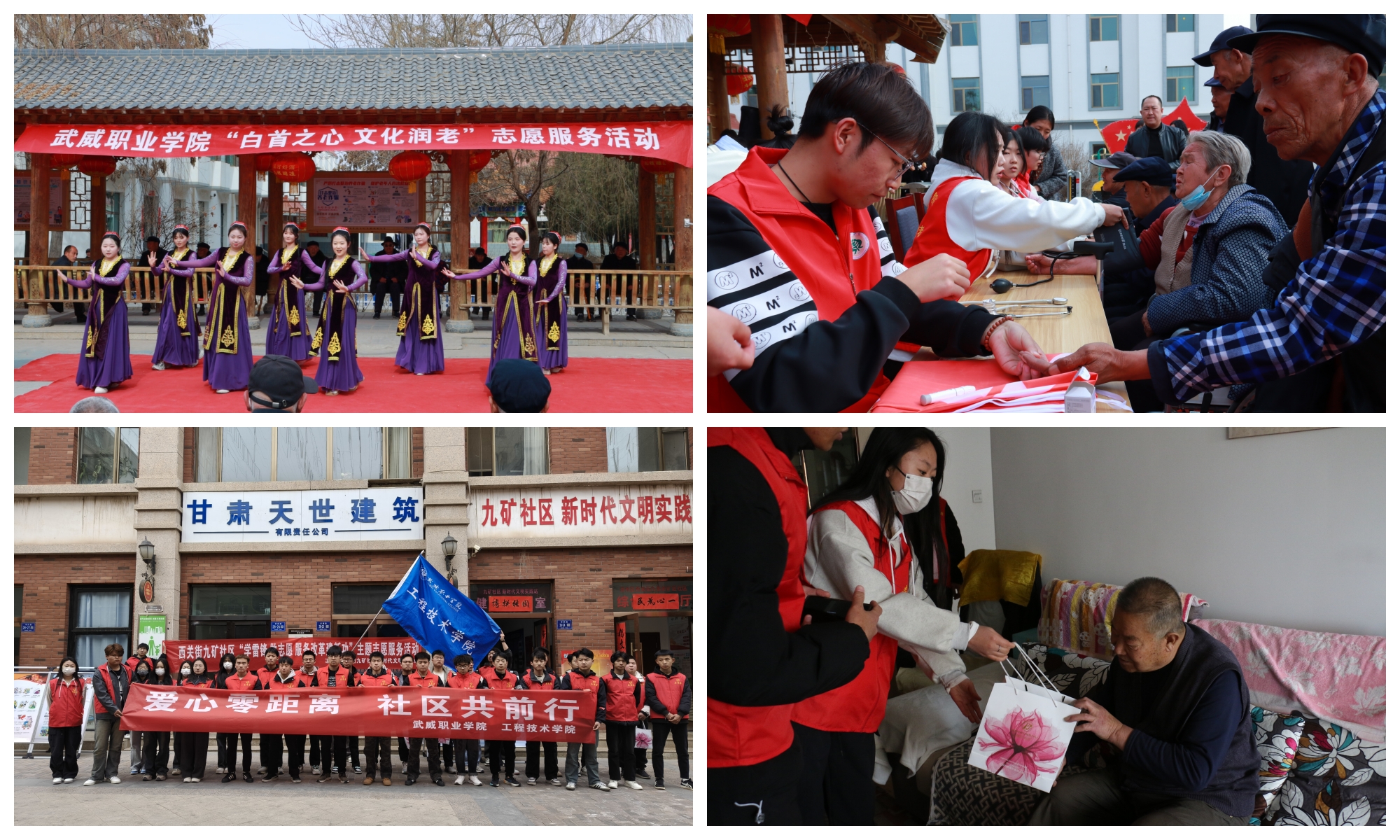 開(kāi)展愛(ài)老敬老志愿服務(wù)活動(dòng)。3月21日,校團(tuán)委組織50余名護(hù)理和學(xué)前教育專業(yè)志愿者,前往涼州區(qū)中心敬老院開(kāi)展“白首之心·文化潤(rùn)老”志愿服務(wù)活動(dòng),為老人捐贈(zèng)生活用品和愛(ài)心物資,開(kāi)展文藝表演慰問(wèn)演出,為老人測(cè)量血壓、血糖,告知在日常生活起居中的注意事項(xiàng),以專業(yè)技能守護(hù)老人健康。3月5日,工程技術(shù)學(xué)院35名志愿者走進(jìn)西關(guān)街九條嶺礦區(qū)社區(qū),開(kāi)展“愛(ài)心零距離社區(qū)共前行”志愿服務(wù)活動(dòng),為社區(qū)孤寡老人、獨(dú)居老人和老黨員等特殊家庭送上慰問(wèn)品,打掃衛(wèi)生、擦拭家具,幫忙照料綠植,并與社區(qū)工作者一起規(guī)范擺放社區(qū)內(nèi)亂停亂放的自行車、電動(dòng)車,清潔窗戶、地面,營(yíng)造整潔有序的社區(qū)環(huán)境。